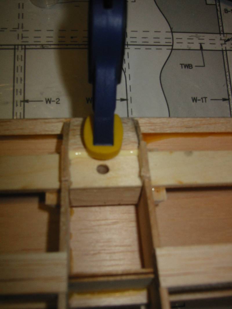 Okay back to the build. The next step after getting the P-1 pieces in is to insert the B-4 leading edge block. After a bit of sanding it went right in. I glued it with Titebond and clamped it as best I could (Picture1).