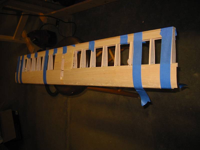 From there, I attached the rear balsa stick trailing edge. Nothing too difficult - a bit of painters tape and wood glue and time.