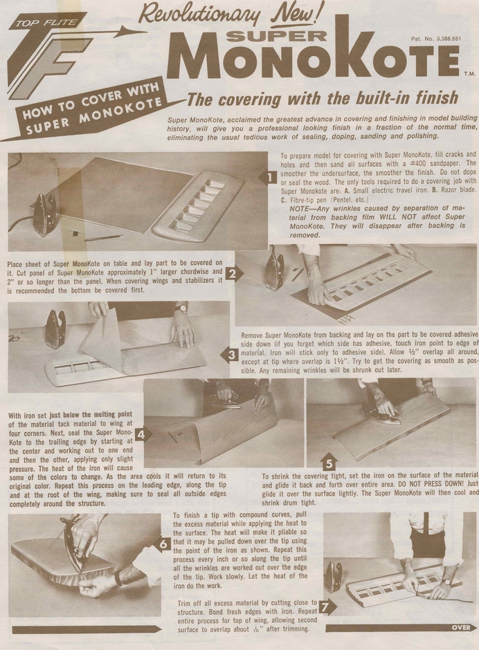 And for bipes you had to use Biscotti. I have rolls of Monkote from the 70s that have the original travel iron instructions. Top Flites FAQs say now do not use a clothing iron. Here is the first page of the original instructions