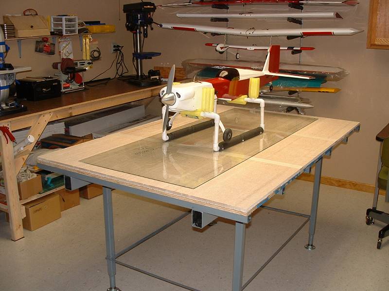 I went down to Staples and bought five of those 30" X 60" brown folding tables with the steel framework. Added/inserted Oak dowels to the legs to bring three of them up to the height I desired and placed the tables in a U-shape in my basement. Went to Menards and purchased two 1 1/2" X 30" X 60" laminated wood tops and placed those on two of the tables. These two tables also get a Great Planes balsa building board placed on top for actual building/pinning of parts. The other table in the "U" has my Dremel saw, fan, etc. for easy reach. The two remaining tables are placed in an L'shape pattern and one is used for laying out build items and the other is always used for cleaning my models and model pre-flight/checking. Each table has a 4' light and electrical service. Set up the whole area in about 4 hours and it's the best setup I've used. If I ever leave the "Land of Snow" it's a simple matter of folding/packing everything up and I can then take it with me.