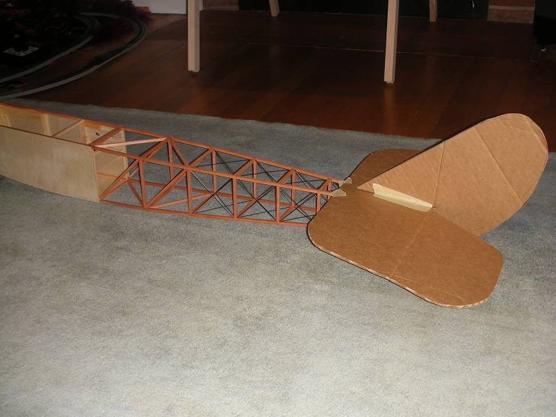 Here are pictures of the stock Antic and Jenny style tails which I fabricated from cardboard to get a visual on how things look. I'm going to think about things a little more before I finalize the tail, but my initial reaction is to make the following changes to the Jenny style tail: 1. reduce chord of elevator halves by 1 inche to get closer to the stock area, and 2. decrease the pointeness of the top of the rudder slightly and beef up the bottom slightly (I think my design is more pointed than it should be). I bought a bunch of stringers so once I get closer on the tail design I'll be able to start building the turtle deck and tail surfaces.