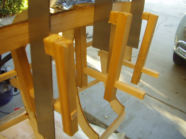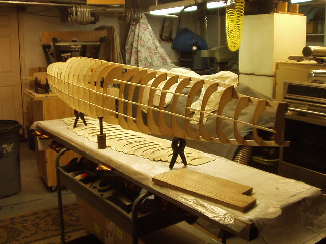 Here's how it started. They call them, "crutches" on the plans. Start with main spars, top and bottom on the assembly board. Then the left half formers onto the spars. Then the 1/4 inch hardwood stringers. Everything seems to be lining up OK.