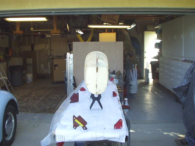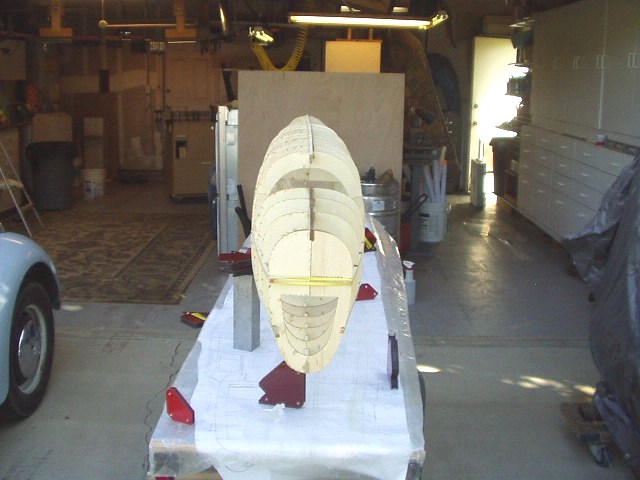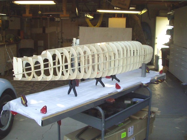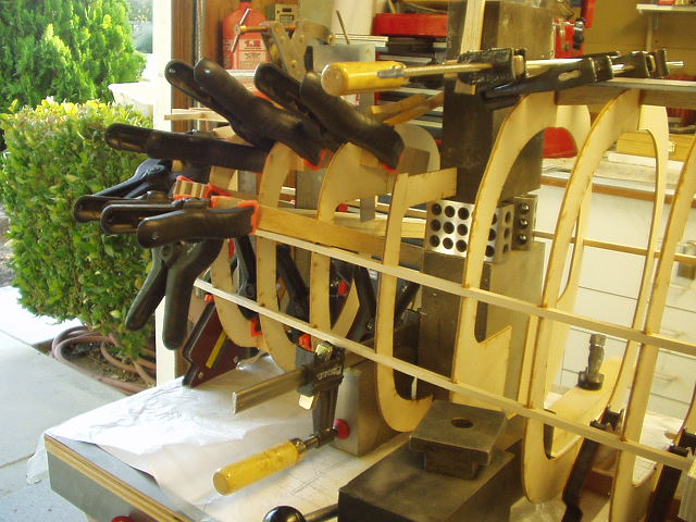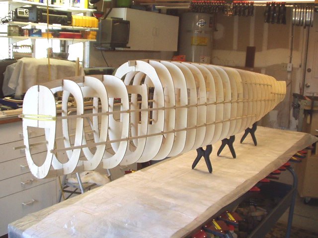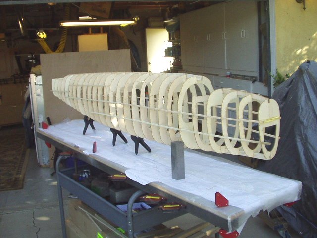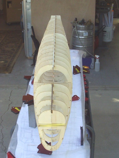 This is for Alex7403. Thanks. When I got your thread about glues that cure into curves in long ones, I went back to mine and did some checking. Yes there was some curvature that I didn't like. So out came the straight edges, clamps, machinists' squares and bars. I took off the right half formers and clamped everything to straight edges and right angle forms and put it on the assembly table against a straight line. Now I'm doing 1 to 3 formers at a time all clamped up and no glue until I check everything for straight. Once all the formers are glued then I'll take the 1/4 inch stringers and starting in the middle, glue out to the ends, all the while checking for square.
