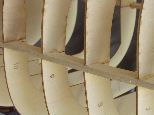 Thanks for the input Alex. I personally think that the Elmer's maybe good in areas of no stress. You can see by the pictures that the 1/4 inch stringers are of hardwood and when you try to bend them to the contours of the fuse that must surely put some stress on the former joint at the keel. It's not a major problem just a nagging one. I clean off the broken joint and dab some epoxy there and this seems to work just fine. I've only had about 10 or 12 separated joints and this isn't much when you see the amount of joints the complete fuse takes with stringers and such. I'm even contemplating making my own hardwood stringers. The ones in the kit are not long enough so you have to use 2 in some places. I can go to Lowe's and get some poplar wood in 8 foot lengths and use my table saw and planer or router table to make some 8 foot 1/4 inch stringers or what ever I need. Then I might soak the stringers in water and try to bend them to the contour of whatever I'm doing and hope that when they dry they will be in the contour I want. I've seen that Norm Abrams on The New Yankee Workshop use steam to bend wood to some pretty drastic contours.