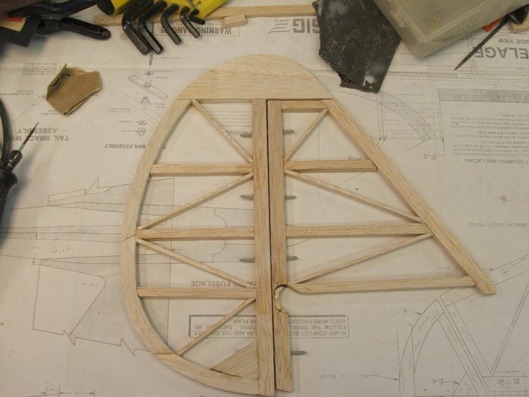 I built the fin post per plans. After notching it out for the joiner, 1/32 ply was laminated to the outside of the rudder post for a little added strength. The tail bracing wires will also help to keep things rigid.