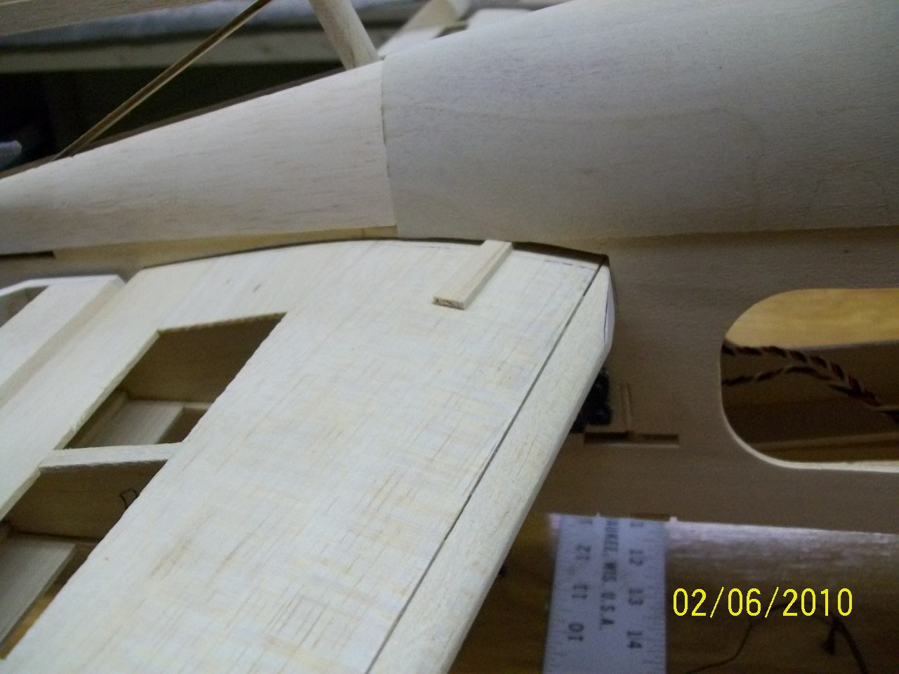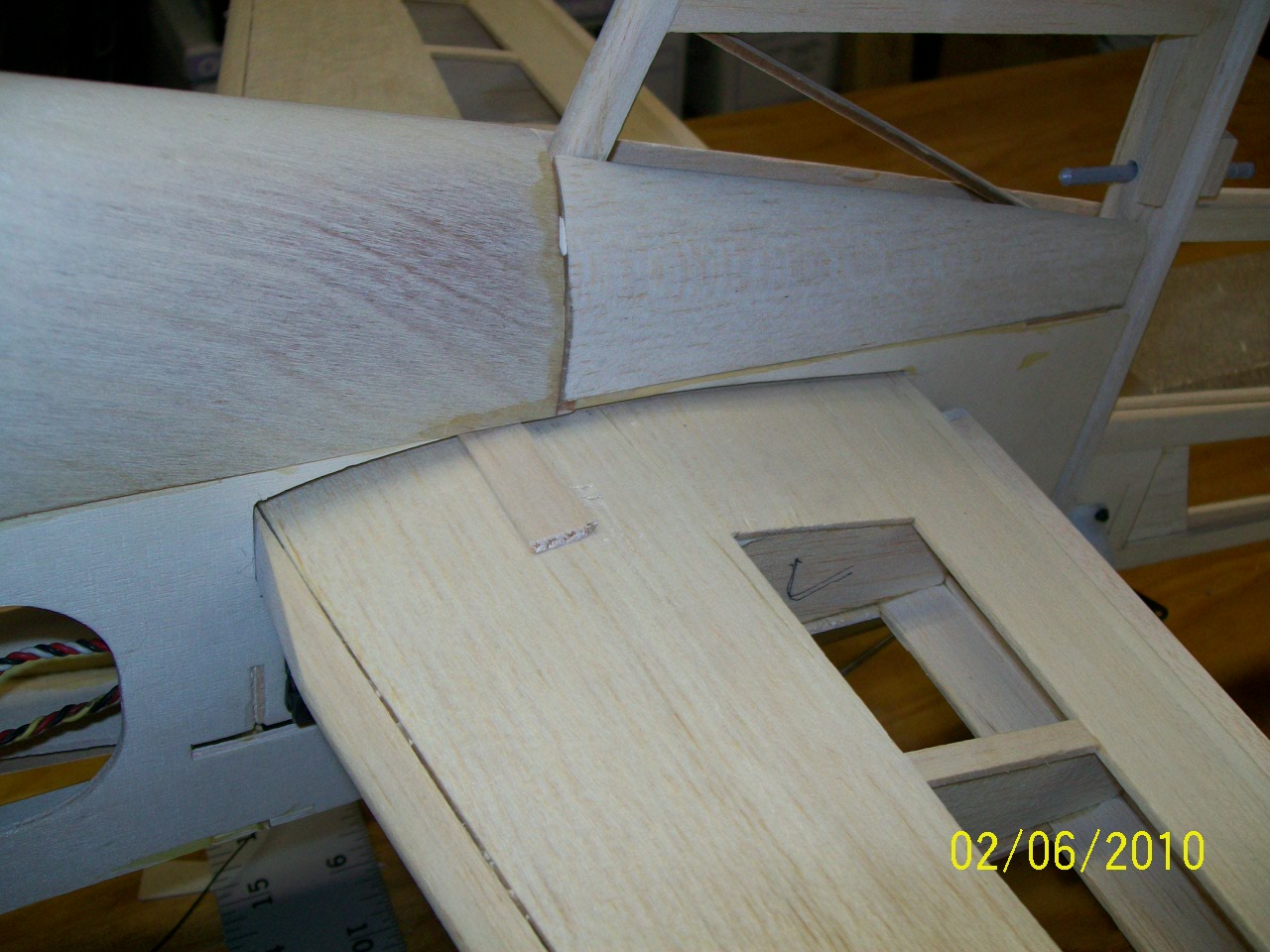 1-Wing saddle needed some shimming to fit the fuse square, I don't know what happened here, maybe I wasn't careful enough when I framed it up. I looked and measure, couldn't find any mistakes so I had to add 3/32 balsa on the left side of the saddle, fuse sits square now.