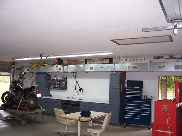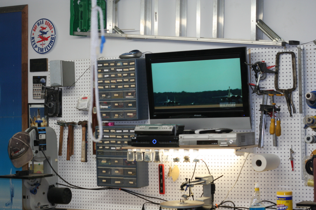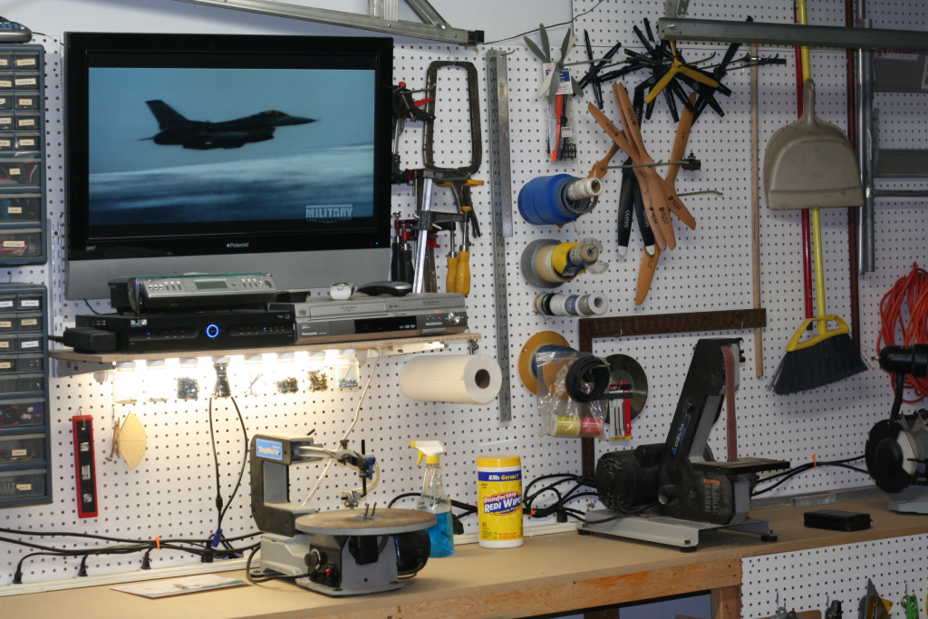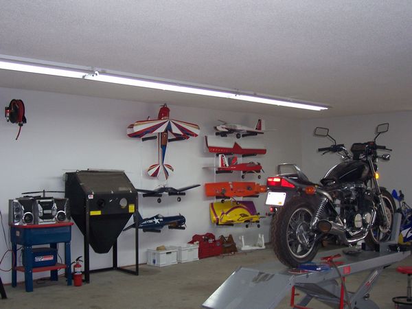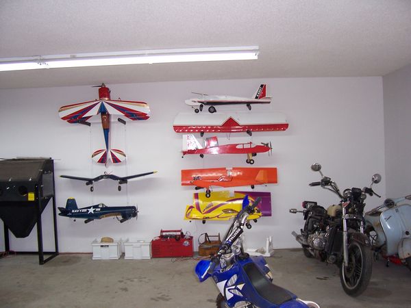Well I am not into showing off and my garage sure isnt a show room but, It does serve my building RC airplanes, Welding, Mechanic, Houshold Projects, Parking for Bikes and whatever else I need to work on. My building table doubles as my welding table and I have 3 other work benches in the garage for heavy dirty work and soldering and electrical etc at another bench and small power tools,drill press, scroll saw, disk/belt sander and standard grinder. I have my computer and a nice old 27 inch Trinitron along with a DVD player on my desk and I have my tunes via a decent set of speakers on the computer. I have tried many ways of organizing my RC stuff that I have collected over the years and hit on the plastic storage drawer sets from Wal Mart as a good way to keep all the little RC related parts, glues, paints, squares,clamps,servos and related electric general stuff that piles up. I aquired a small roll away from my son and installed drilled wooden shelves/rails around 3 sides drilled with many holes of various sizes to accomodate all the tools needed to build and maintain my airplanes. I put a Robart plastic airplane holder on top and it is sufficient for an airplane up to 60 size to do general maintainence or whatever. I am never really done organizing my things it seems but that is fine as it changes with my current needs. I store my airplanes overhead to keep from bumping them and getting hangar rash, I can even charge most of them hanging up. I really would like to have at least 2 larger building tables as I mostly always have a kit being built and there is always at least one airplane that needs some work. For what its worth here are a couple of pics of its current state, it is always changing to meet my needs and I have everything on wheels that I can. My building table is aircraft grade aluminum honeycomb so it is dead flat, just wish it were larger.
