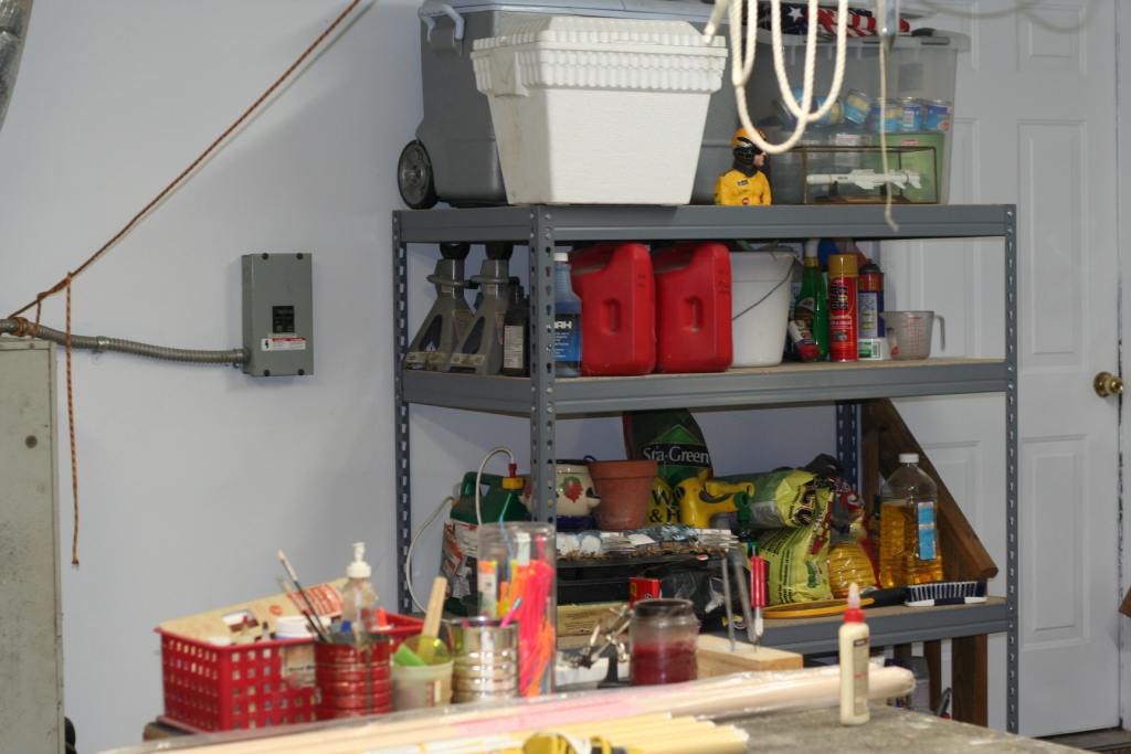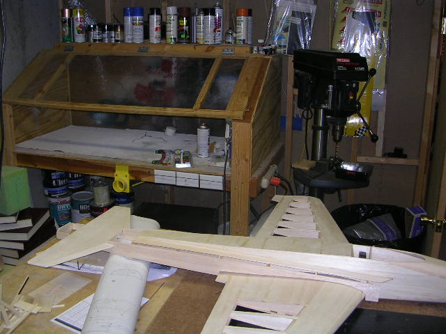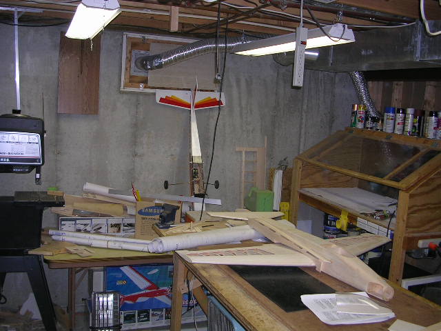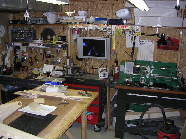 <span class="Apple-style-span" style="font-family: 'Times New Roman'; font-size: medium; "><div style="margin-top: 0px; margin-right: 0px; margin-bottom: 0px; margin-left: 0px; padding-top: 0px; padding-right: 0px; padding-bottom: 0px; padding-left: 0px; background-image: initial; background-attachment: initial; background-origin: initial; background-clip: initial; background-color: rgb(255, 255, 255); font-family: Arial; font-size: 12px; background-position: initial initial; background-repeat: initial initial; ">Converted 2 car garage. Pictures are basically a "circle" around the shop. Somehow, in all this, i never got a shot of the build table in the middle. It's a 3' wide solid core wood door on a framework with bays for balsa/rod/stick/covering storage, and rolling casters.