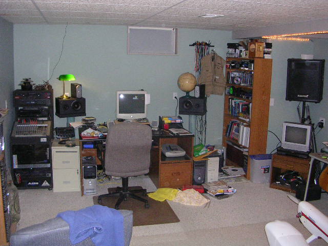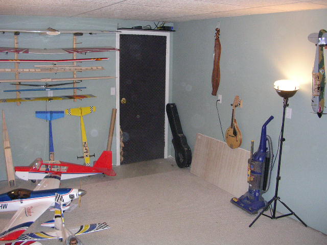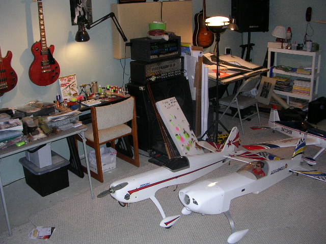 Ok, since I asked, thought I would show my current conditions. As with most, I have many hobbies. My larger room was converted to a home studio for a while, now I am past that serious phase, I am thinking of making that room my serious building room again. As you can see, I have fly-tying, guitars, a drafting board, and some other stuff in that room that could come out. Then, in the smaller room, my building stuff is packed in, including a lathe, paint booth, drill press, grinding wheel, etc... So. I think its time to reverse it and get my larger building room back.......