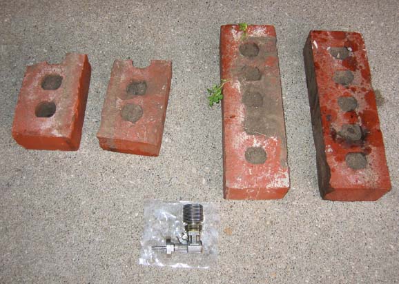 Just incase there is any question about what we are talking about here, I have attached some photos. The Vmax7, during break in and running rich, proved too manly for the bricks on the left. The bricks on the right held things under control, but the plastic landing skids were flexing with some serious protest. That is the Vmax6 in the foreground for reference.