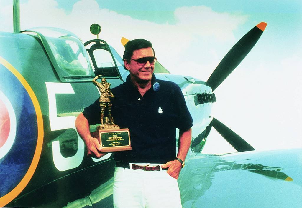 "....One of Robertson's main hobbies was flying and, among other aircraft, he owned several de Havilland Tiger Moths, a Messerschmitt Bf 108 and a genuine World War II era Mk.IX Supermarine Spitfire MK923. He even entered balloon races, including one in 1964 from the mainland to Catalina Island that ended with him being rescued from the Pacific Ocean. A certified private pilot, Robertson was a longtime member of the Experimental Aircraft Association, working his way through the ranks in prominence and eventually co-founding the EAA's Young Eagles program, on which he chaired from its 1992 inception to 1994 (succeeded by former test pilot Gen. Chuck Yeager).