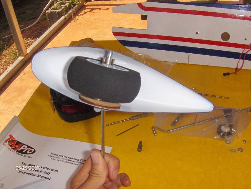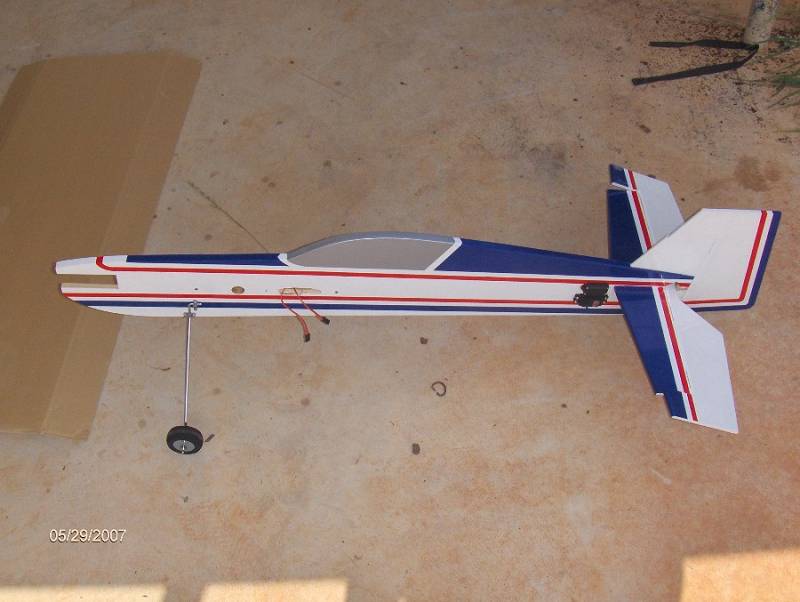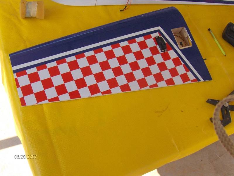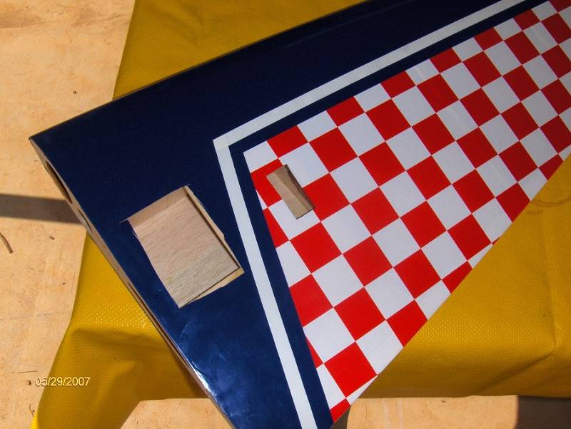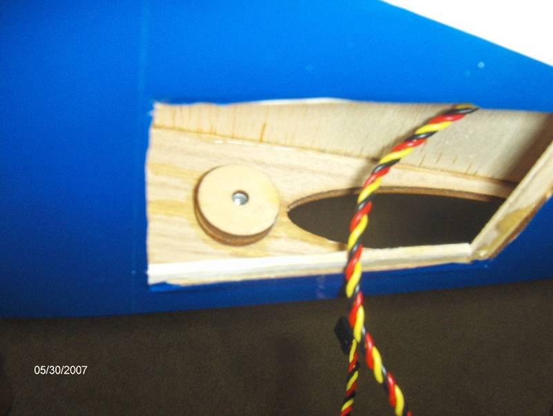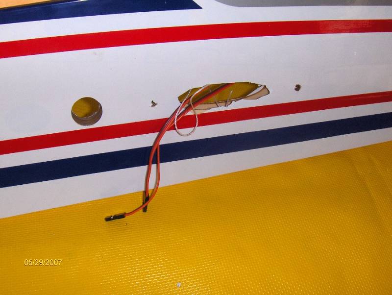 Now for the fuse. I cut the holes for the servos and for everything else on the fuse. I notice when I cut the holes where you put the wires through there was string. The string is for to pull the servo extensions through. I had problems with the Katanas pulling them through. But with this one it was easy! They gave you enough room in this one to pull both wires through. As you might notice one of the holes I cut didnt come out that pretty. I forgot to bring my iron down to the lake to fix it up. After installing the servos and the extensions I went through and glued the horizontal and vertical tail along with the rudder and elevators. Plus I installed the tail wheel.