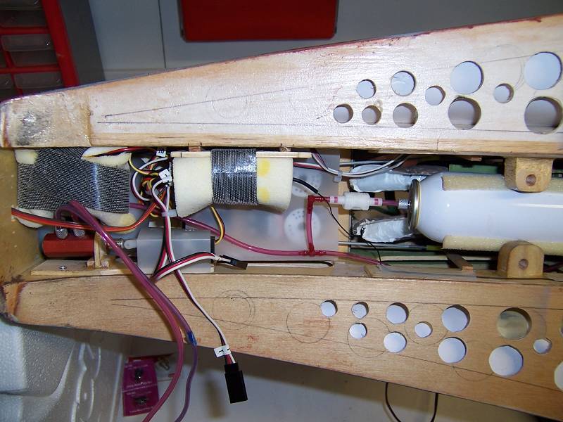 The next photo shows the LiPo battery for the DF velcroed down on top, the microswitch that controls the onboard glow which is activated by a wheel collar on the throttle arm and the NiMH battery.