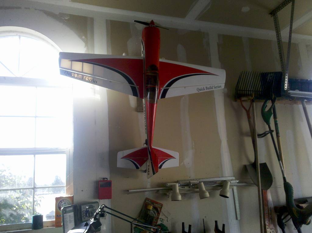 OK I know it's a little early to be worrying about winter storage but a recent picture of how someone else keeps their planes got me thinking about another post I read that said it was better to store your planes nose down -supposedly to keep the bearings lubricated. Don't know if there's a good, better, best and definate no - no, when it comes to how you store your plane(s). I made some brackets to fit the landing gear of each plane I own and store them vertically on my garage wall(s). This way I can put them up in one piece (wings included), and take them down by grabbing the rear of the fuse. I can also charge my batteries while the planes are out of the way, still on the wall. But I'm curious, other than making sure that all the fuel is gone after each flight (the mufflers will drip a little old fuel) should I be concerned about storage this way? Or would it be better to store them horizontally, using the ceiling as some people do? What does the RCU experts think? Here are a few pics of my entire hangar (garage walls) to date. Also says something about my flying progression since getting back into the hobby. IF you're curious, I went from the estarter foamie to the trainer, to the yak and then the escapade. Still enjoy flying each one but the escapade has become my favorite flyer. But thats another thread.