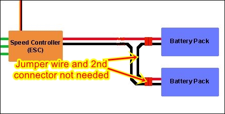 The esc is setup with the battery packs in series just like the 1st picture Rusty posted. Personally I'd break out the soldering iron and get rid of one of the connectors but you can buy/create an adapter as well.