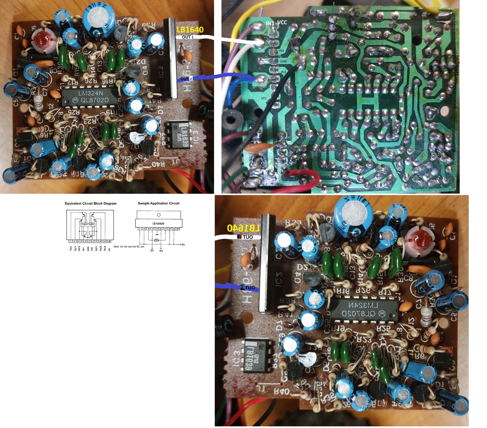 on the pics below i inverted the picture on the bottom to match the circuit on the top and try to find out the componants before IN1 and IN2 on the LB1640