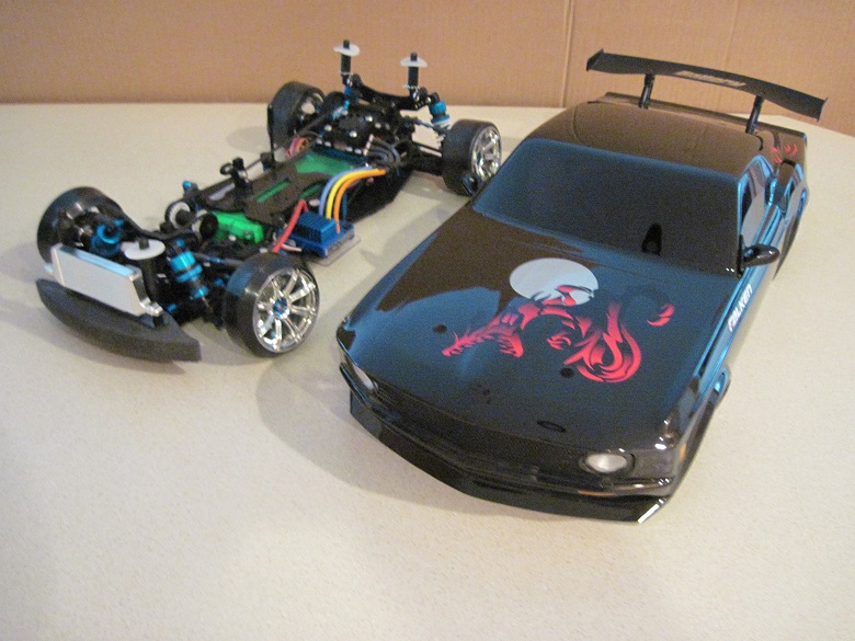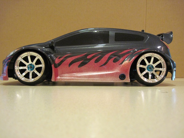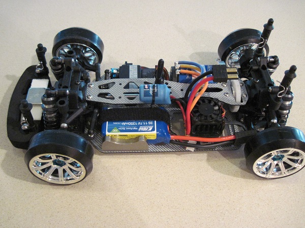 When compared to the pics above, you can see the Genetic's electronics on the left side have been reversed, and the LiPo is a 2S, rather than the 3S that was mounted before. The reasons for this are: The Motor is now a 17.5T Speed Passion Stock-Spec, which is MUCH more suited to drift, than the 6.5T that was in it. It's also sensored, so it is smooth, too! The Genetic is still rather fast, RPM-wise, so it can still gymkhana, with HPI A-drift tires, so this combo works well.