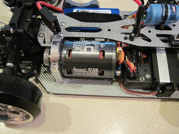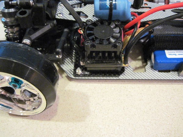 I also mounted the ESC on a carbon plate from another carbon chassis conversion that was not used in that particular chassis, and it worked well here, since there isn't much in the way of chassis to servo-tape the ESC to, since the left side of the Genetic's chassis is cut out, since the left side was the battery side, in stock Genetic layout.