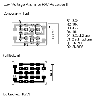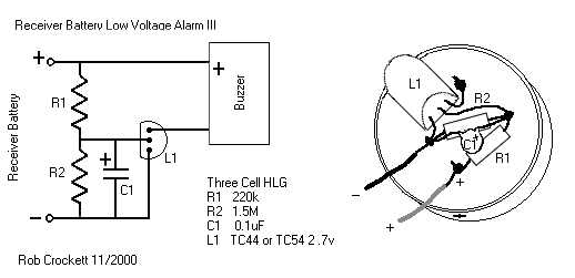 Both sound a piezo buzzer (take off an old computer motherboard) when they reach their cutoff voltage. BUT via the capacitor, they also can sound off with vigorous movement of servos as they temporally load the battery on startup. The caps as shown allow intermittent sounding as the battery nears drained. A higher value cap will limit this tendancy. So if the model is lost you can wander about waggling your controls for some hours and getting intermittent beeps.