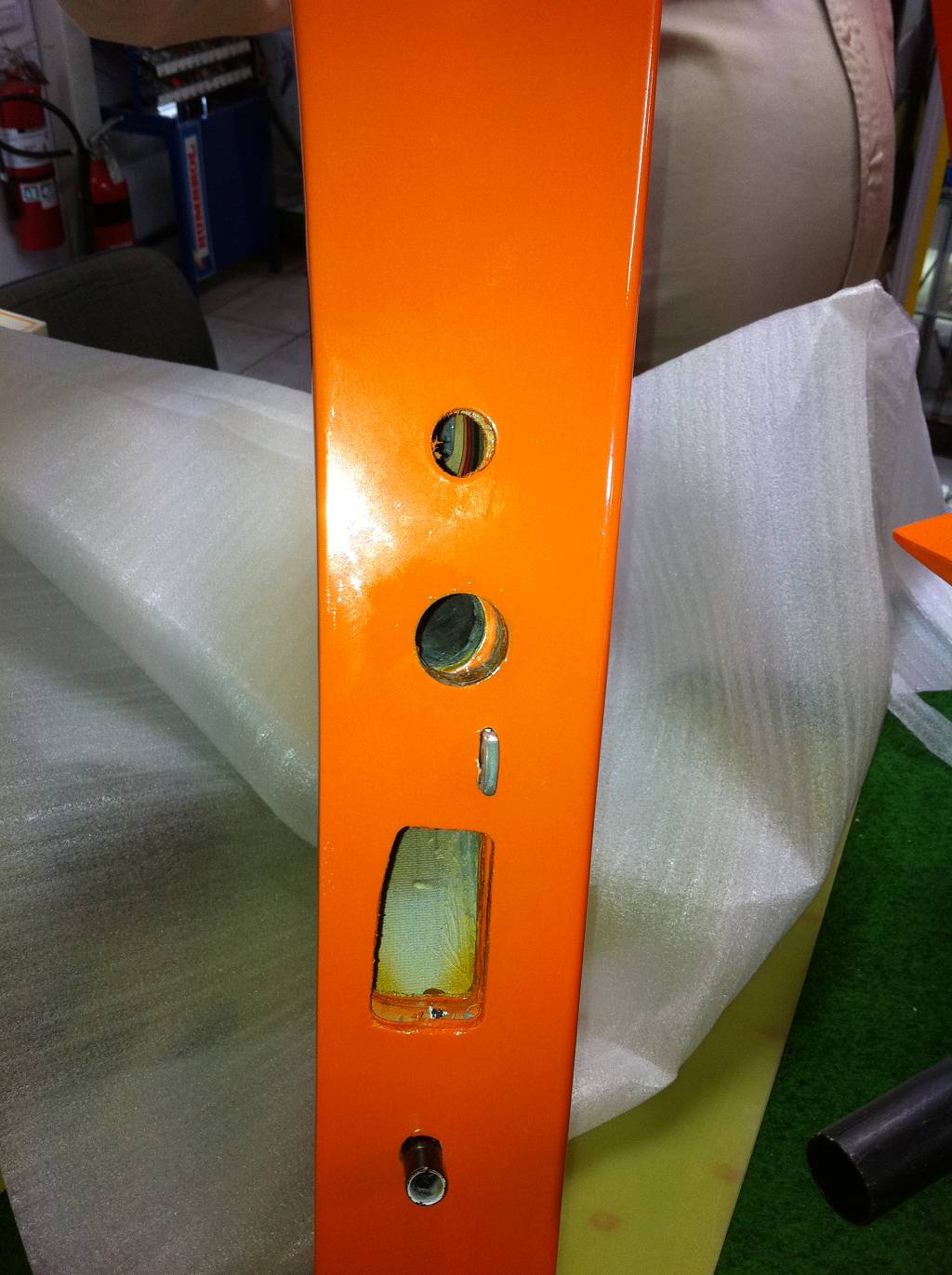 The butchering of the wing root of the fuselage is what worries me the most. The hole goes all the way through the edge of the retract mounting box. So, the bottom corner of the retract mount is no longer there. I think this is probably repairable if the hole was filled up with hysol or something and then re-slotted for the wing retaining tongue, but both tongues will need to be removed from the wings and turned around so they can be re-drilled and tapped [:@]