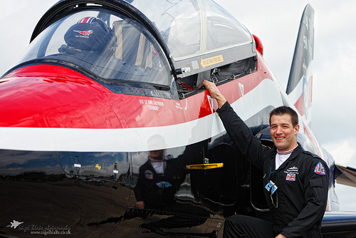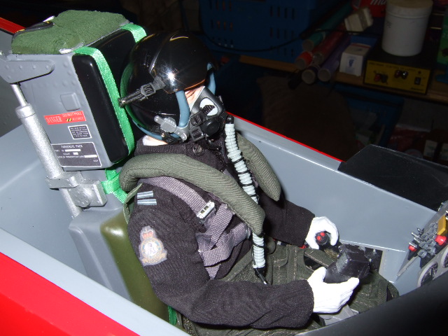I have got two pics which shows a bit of detail red, white and blue stripes. I think they use the black flying suit and painted helmet on show days.