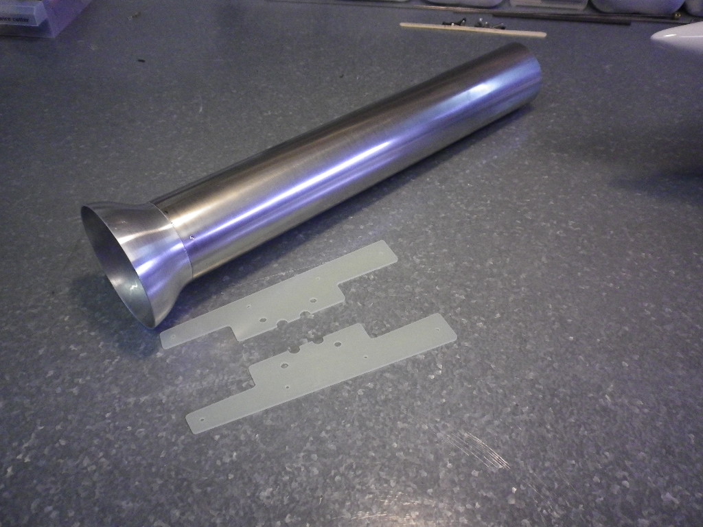 The pipe took a little working out to get it to line up nicely but eventually came up with a simplish method using two ali flats screwed to the side of the pipe using the same fixings that secure the bell mouth to the main pipe, these were bent to shape to allow the unit to screw to the rear former sides with two servo type socket screws.
