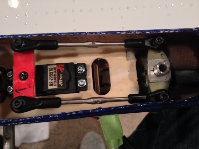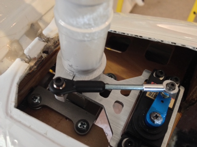picture of nose collar (spare one). Although rudders are small elected to do pull pull with metric secraft parts. Be forewarned the plastic is very hard on their ball links and I could not get them to self-thread so had to use left and right handed 3mm taps.
