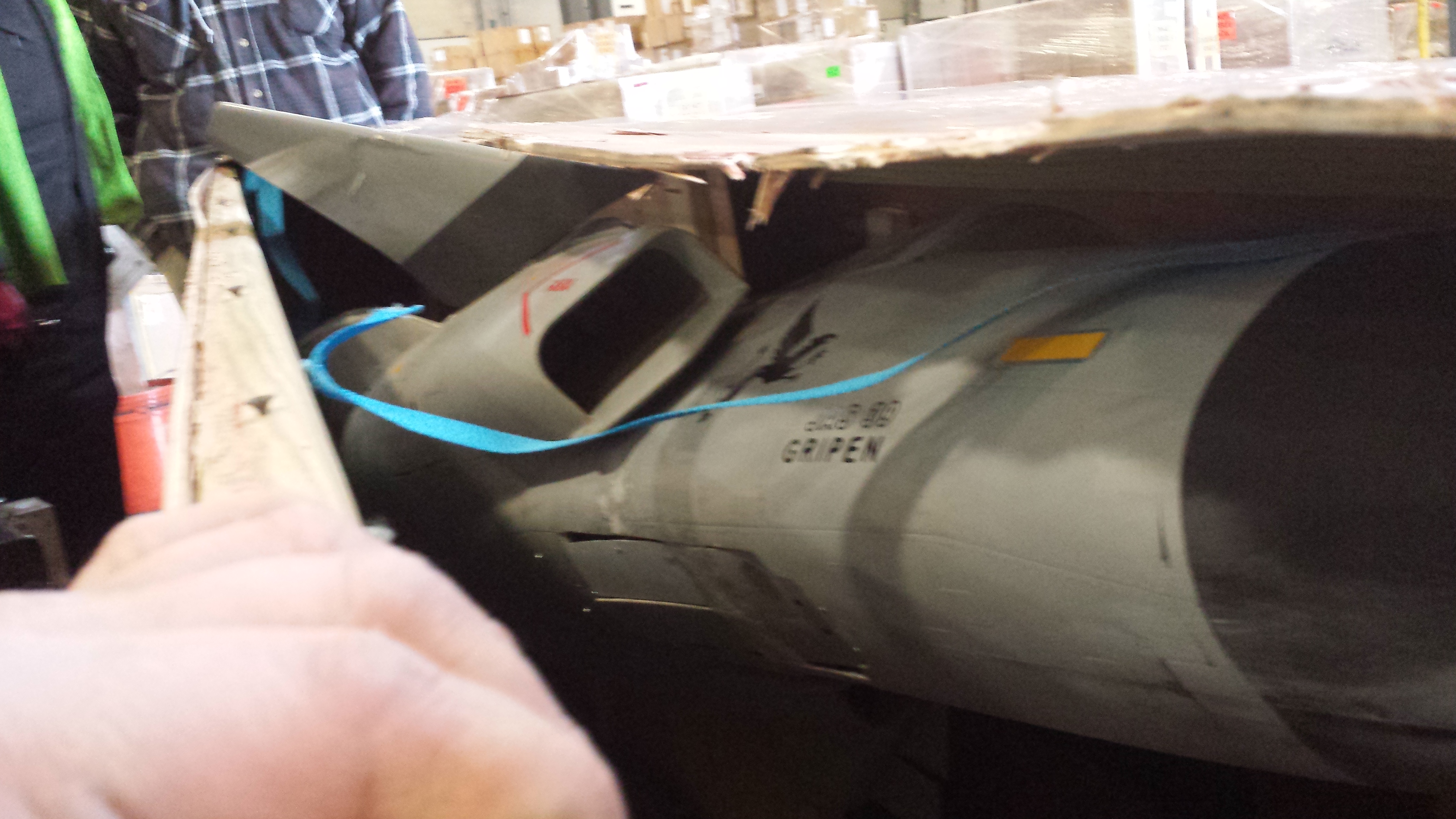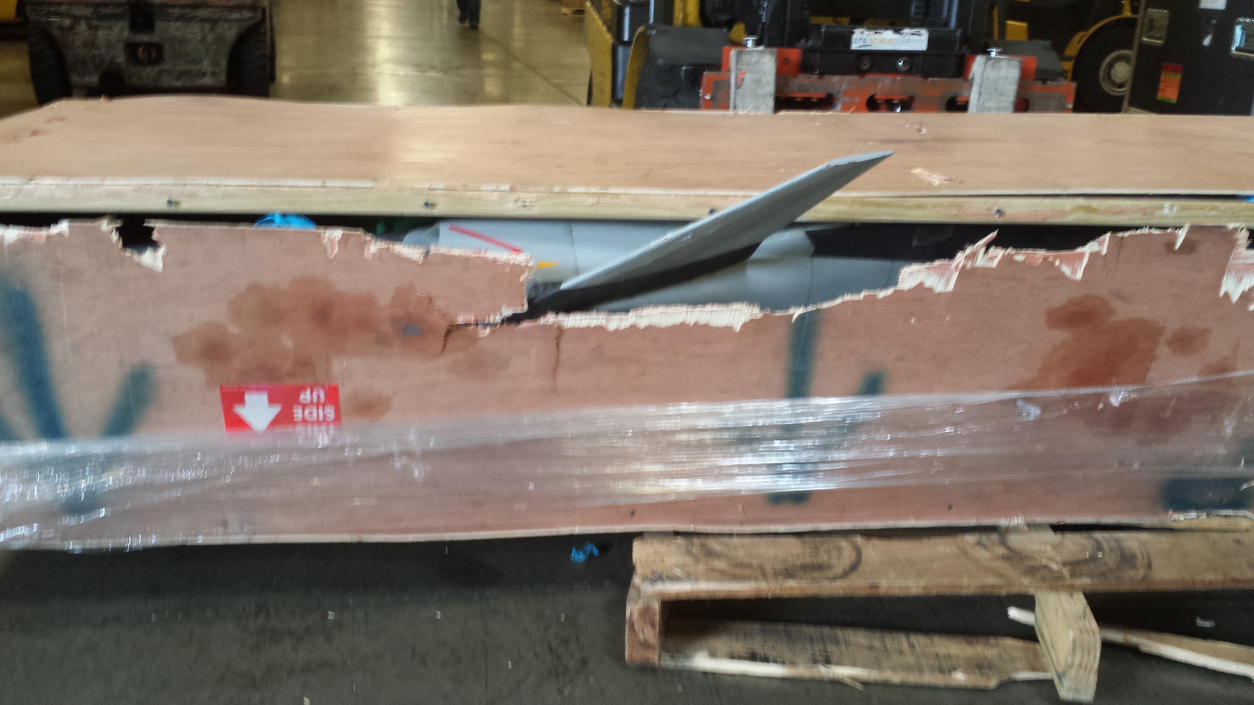 Buddy of mine received a big-a^^ A-10 in a crate that had been 'speared' .... but not in the wide side like one would think, rather in the very narrow end! Only way that could've happened was if the fork-lift driver was 'pushing' the crate around trying to maneuver it into position. He had to fight with Forward Air Freight to get paid what it required to repair and repaint the damaged fuselage (A-10 had been expertly done up in the Warthog scheme)