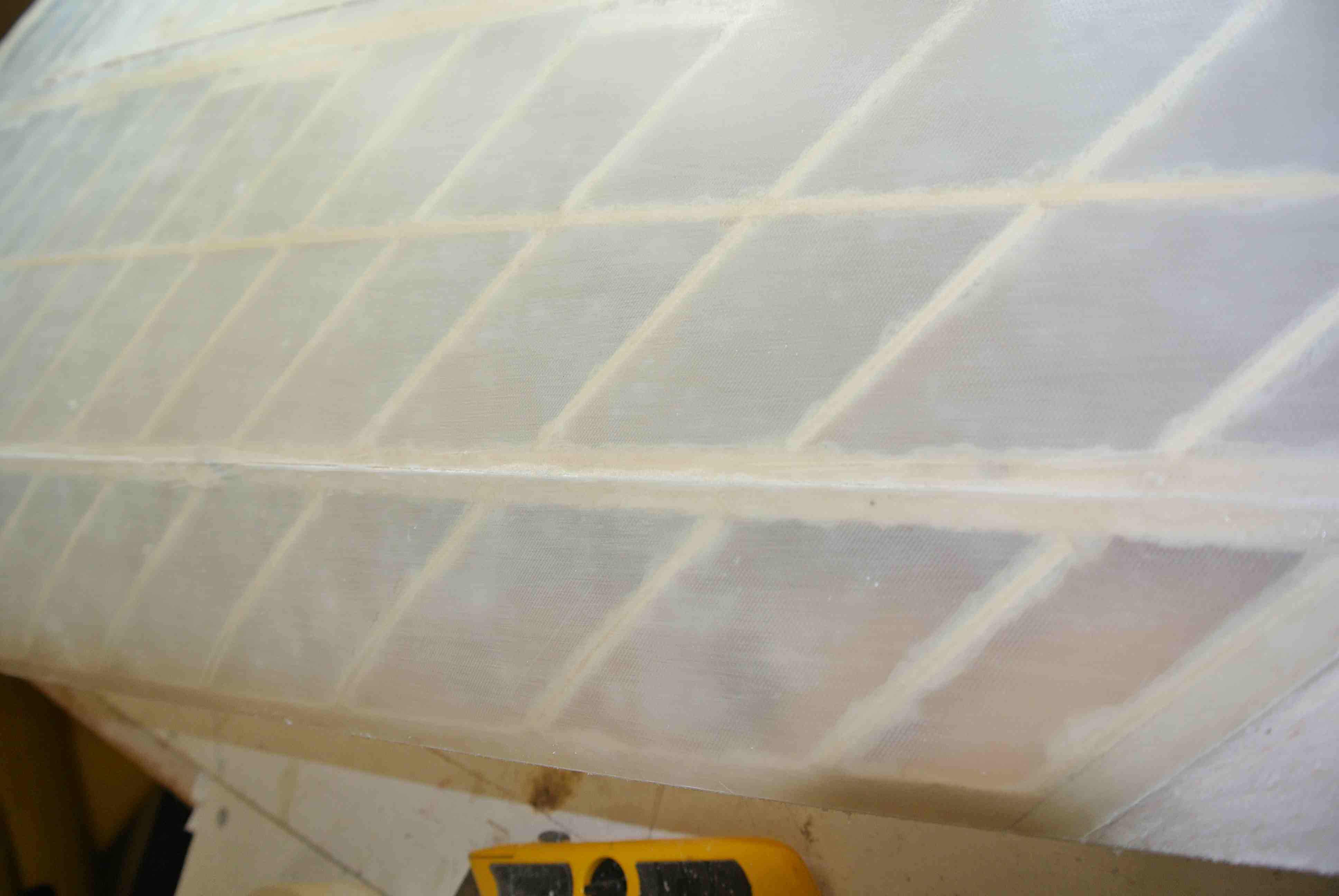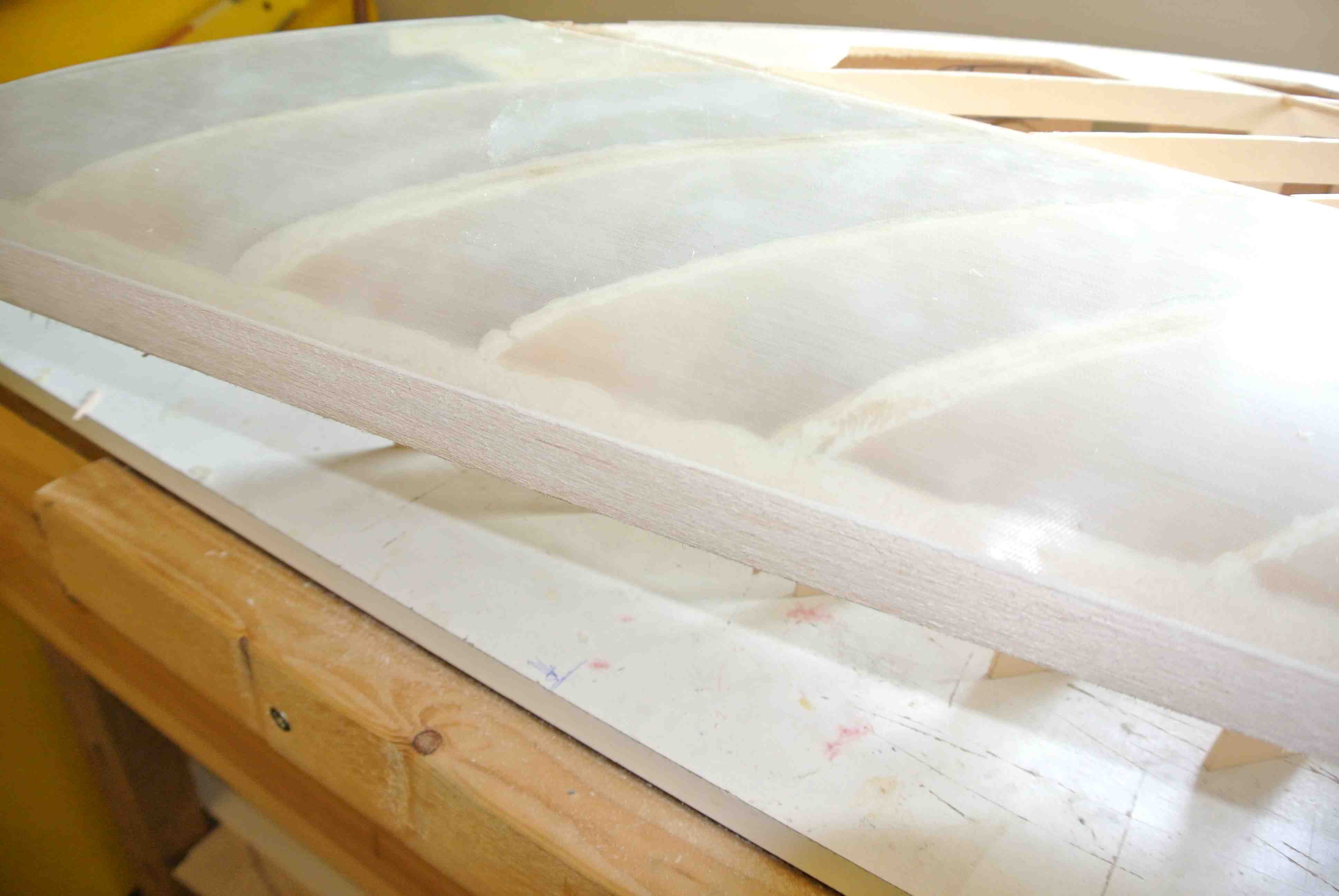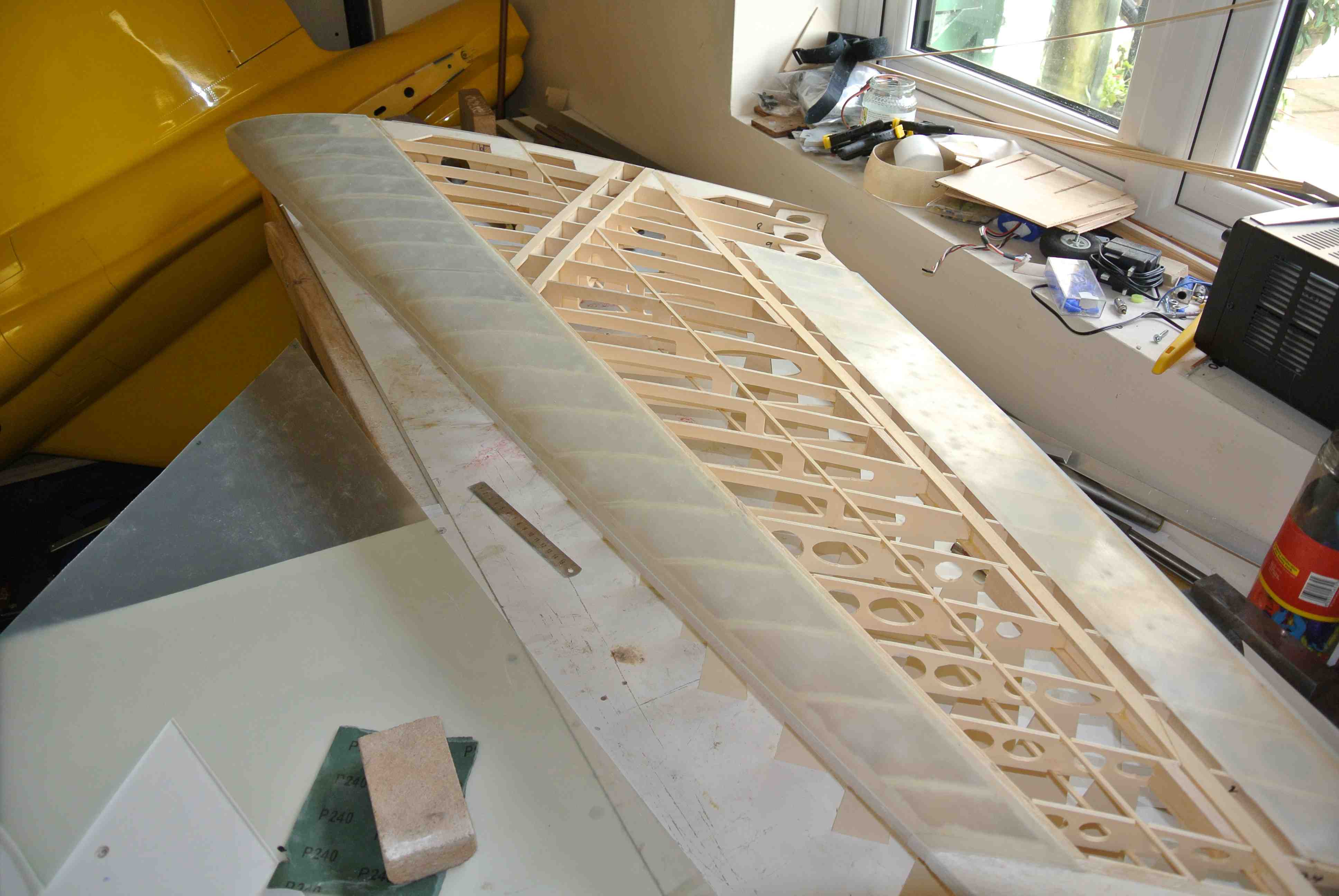 Oh I forgot to add that I used Joiners Mate 5 Min PU glue on the recommendation of a friend who had just completed covering his MR Hunter. This is a much better glue than Wudgrab PU glue normally used. The Joiners Mate is a low foaming thixotropic glue that does not drip. It has a slightly longer working time than the Wudgrab and is made by Geocell. Covering wings with Proskin is not for the faint hearted and it is easy to make a mess of it. It is vital to load the skin down firmly against the structure and to pin it in a few places to stop it sliding about.