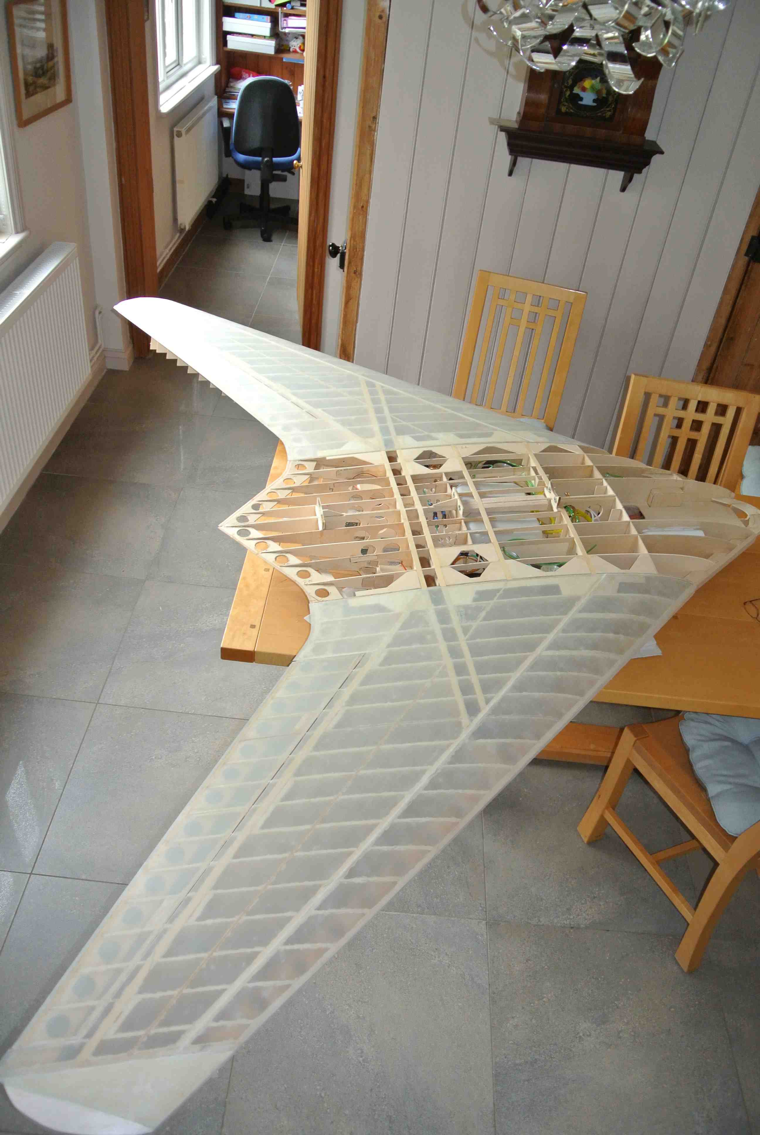 Some progress photos for you. I have completed covering the upper surfaces with Proskin. This was not straightforward with the compound curve wing and the stiff flat nature of Proskin. I had to cover in 3 pieces, the elevons will be cut off later anyway, the leading edge and the main surfaces were covered in 2 pieces joined on the spar.