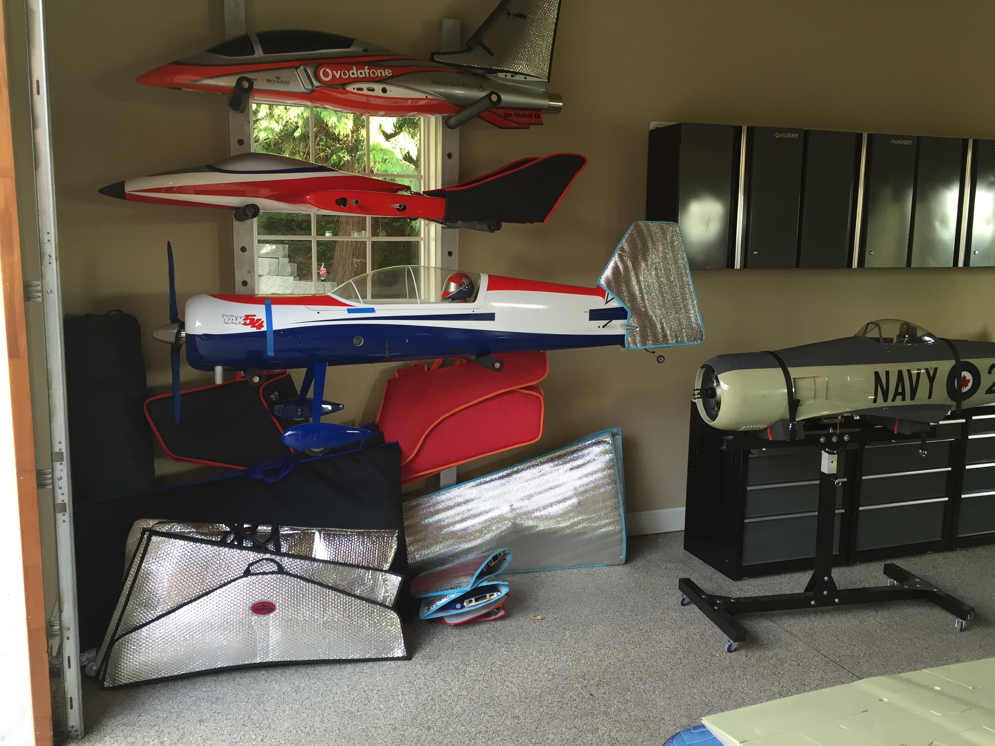 Hi, I store my wings against the wall in the garage. I run 2X4s vertically fastened to the wall about 3 feet apart and drill 3/8 or 1/2 inch holes in them- matching holes in the adjacent 2x4s. Install appropriate size dowels in the holes and place the wings on the two dowels in the adjacent 2X4s.. -- .---------------------.-- like so. That's supposed to be a wing supported by two dowels. Oh, well you get the idea. I hang my fuselages from nails pounded into the wall. I bend coat hangers to go between the prop and the fuselage and hook the hanger hook over the nails with the fuselages hanging below by the prop-- tail down.