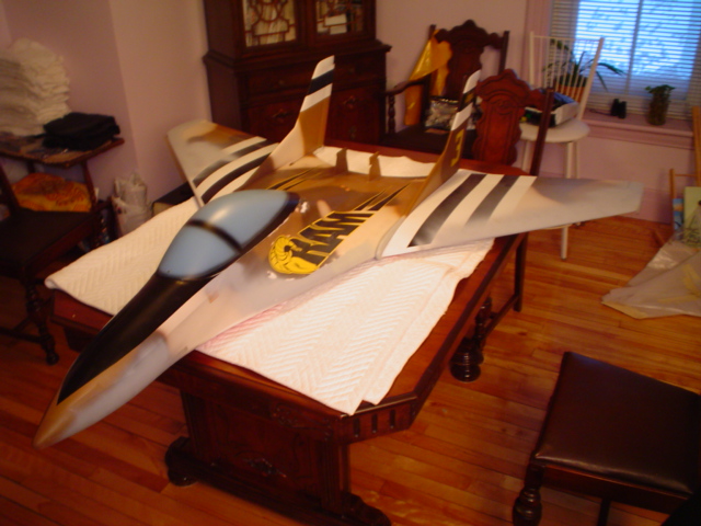 My first jet just arrived today!! Its a second hand C-ARF Roo, everything looks pretty good except for the gear door hinges are cracked. I think ill refrain from using gear doors anyway to cut down cost. It has a 2L coke bottle tank, I think I may save up for a kevlar one. I am planning on using two Futaba 9303s on the elevons and standard servos on the rudders. Ill save up for the Robart gear, especially after hearing all the horrors about MMs gear. I plan on re painting the whole jet, if anyone has advice on how I should prep it (sanding, priming, etc) im all ears.