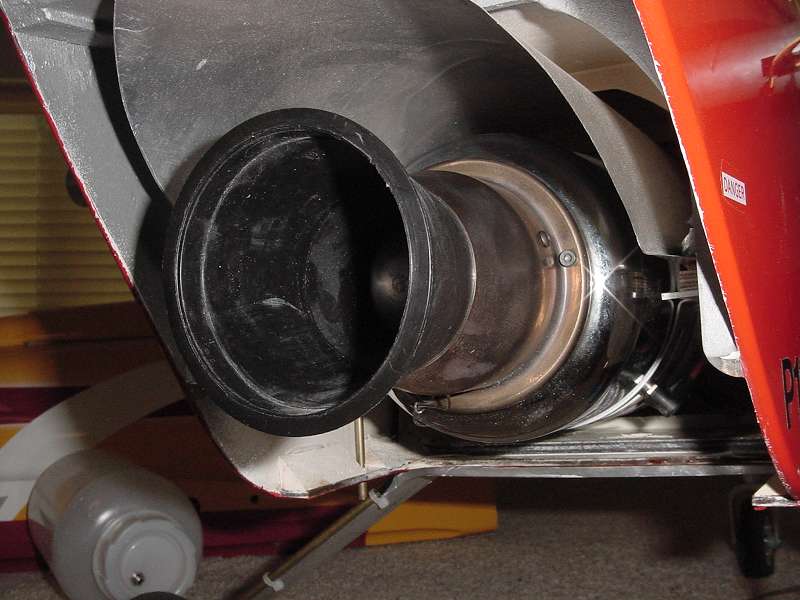 The black cone I had laying around and I believe it was some sort of protective cap over a large insulator for power generation lines. But it could easily be made from thin fiberglass over a mold or even rolled out of stiff cardboard. I trimmed it so that it would be a tight fit onto the inner tailcone of my P120. I made sure that it didn't contact the EGT sensor. I slide it over the inner cone until it comes up snug against the inside of the outer cone.