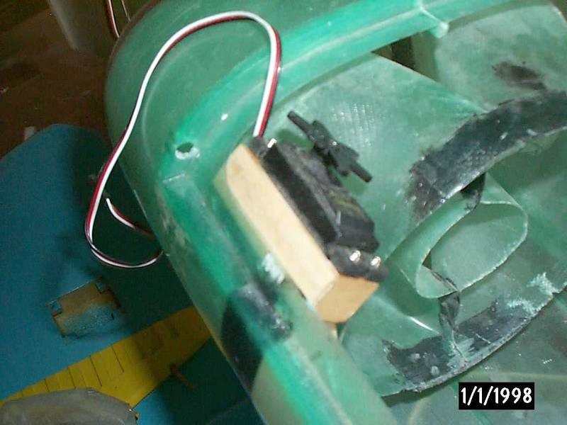 Second: Avoid putting servos in the tail at all cost! If you use the recommended hardware (metal wire pushrods in plastic sheaths), you'll have minimal slop/binding. The servos in the tail 'work' fine, BUT it translates out to a lot of unnecessary lead in the nose. Two ounces in back might mean as much as 6 or 8 up front to counter it. This is a bird that you want to have as light as possible. Trust me on this! If you've got the newest kit, there should be plenty of room for the servos in the forward hatch area. Rig up the linkage first, then place the servo to meet it instead of the other way around. That way, you'll get the proper spacing between the servo and the inner wall of the fuse.