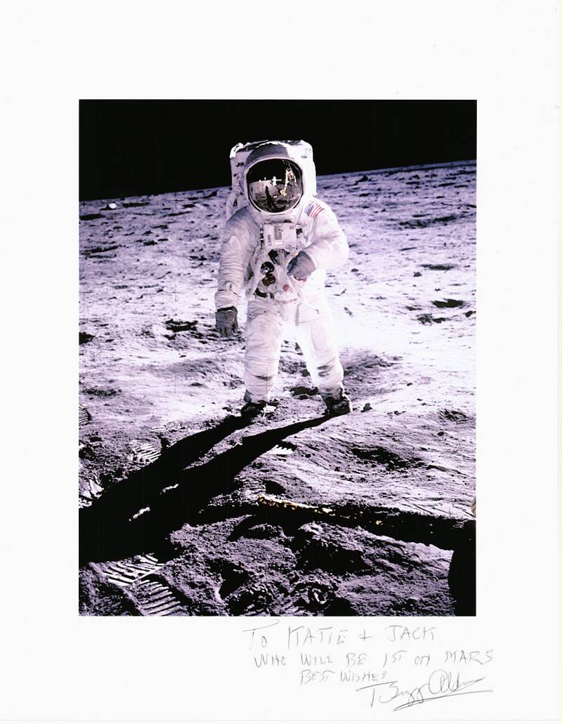 A few years ago I caught wind of the fact that Colonel (retired) Edwin E. Aldrin was due to visit us in the Advanced Programs section at the NASA Michoud Assembly Facility on the very next day. Normally the twelve who have walked in the lunar regolith do not (at least the ones still alive) sign autographs. But Buzz was here kissing up for some Lockheed Martin funding for a reusable booster that he was on the board for. So I asked my boss if I could ask for an autograph and he said sure. I asked Buzz to write "to Jack & Katie, may one of you be first on Mars." But he messed it up a bit. Now I always tell the kids, "well Buzz laid down the guantlet: you gotta do it now!!!"