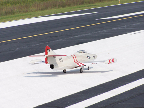 Landing technique - The plane cruises around very nicely at 65 - 70 % power ( 14 lb turbine ). Prior to a loop - I go to full throttle and just pull and she loops beautifully with no tendancy to fall off or corkscrew like some 50s era jet fighters. When you are ready to land....maiantain 50 - 60% power drop the gear, then go to half flaps. The plane will cruise around nicely in this configuration. After a pattern or two drop to full flaps. Add a little power - to 70%. Once again the plane will stay aloft in this configuration and is very stable. KEEP THE POWER ON THROUGH THE DOWNWIND LEG. Now once you are set up for base SLOWLY begin bringing back the power until on final you are carrying only about 15 - 20%. Initiate a flare and bring the throttle to idle. Hold her off the ground ( at 3 - 4 ft ) with elevator progressively holding more elevator. The plane will land INCREDIBLY slow and softly. Grumman had a winner with this early carrier jet and it really shows its stuff on slow landings. But this is the key. Hold it off until all the lift is gone otherwise you will find yourself flying again! I used this technique many time over while demoing the Panther ate Jets over Whidbey. Many were astonished at how slow she will land.