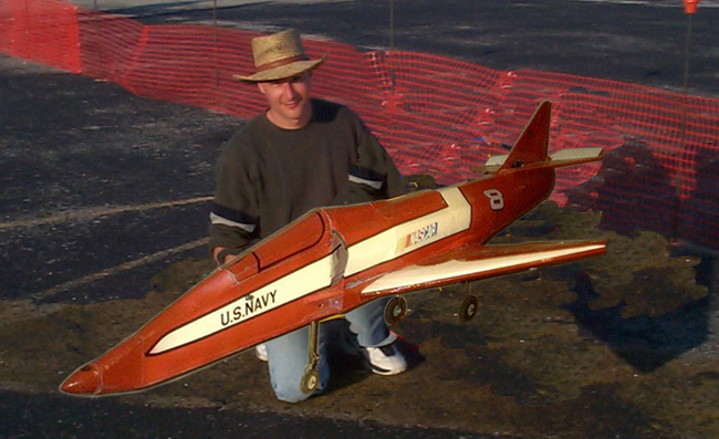 An F-107A. I am considering building another one of these, with a bunch of lessons learned from this one. Although this one isn't finished either. In fact, I'll be jumping back onto it in a few minutes. The last scratch built jet I did was for .45 size DF units, back in the Terry Best Invader days (~1990?) It would probably be a good size for electric now.