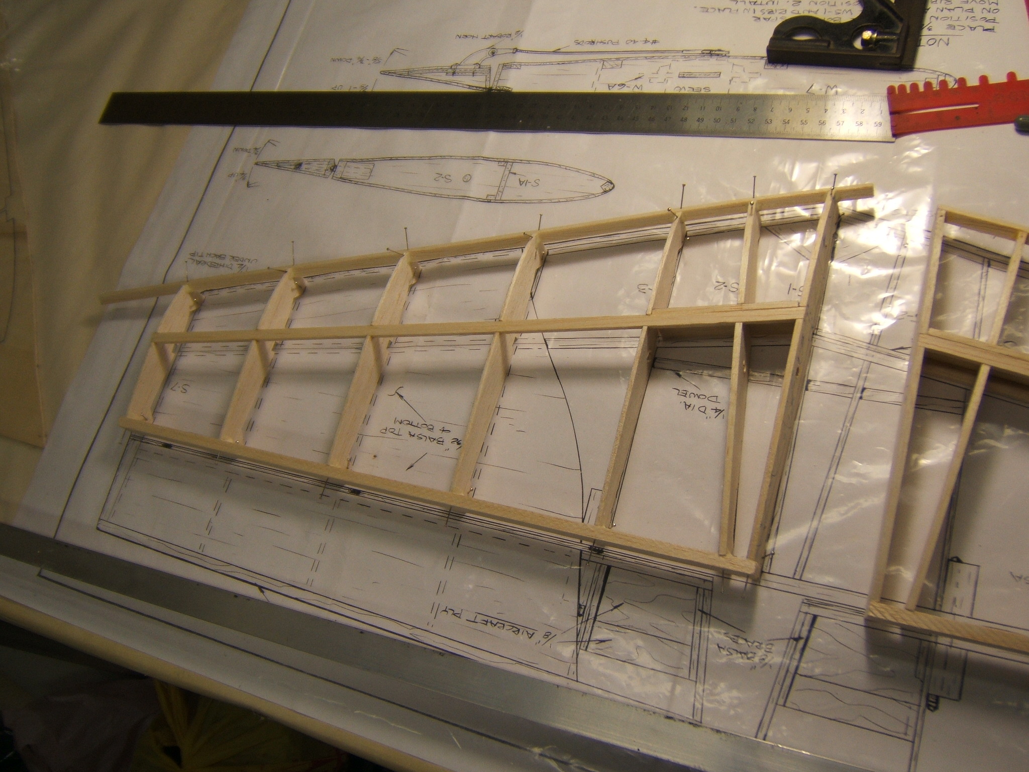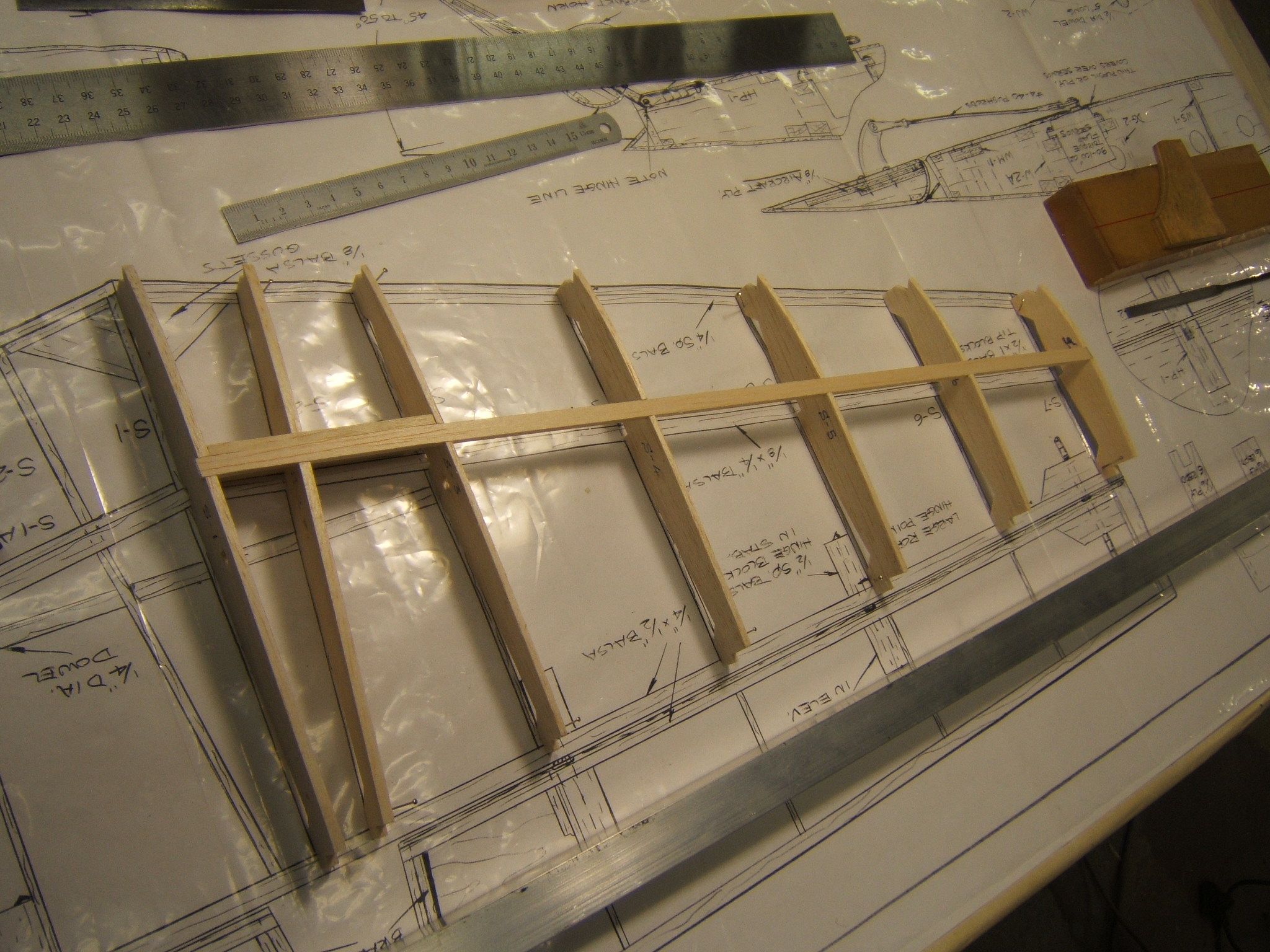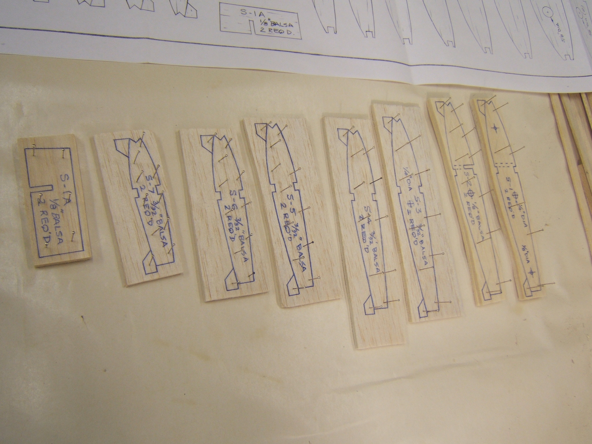 I placed the stab ribs on the drawing,as per instructions and this is the start of the assembling process. Just align the trailing edge side of all the ribs,with the trailing edge on the drawing. My stab ribs,do not align exactly with the drawing. So use the trailing edge as a reference. There is a photo of the page,that refers to S-AG,which must be inserted into a slot in S-2. This places S-1 on the correct angle. I don`t see this S-AG on my drawings at all. It must be a printing error? This is not the 1st error that I found.