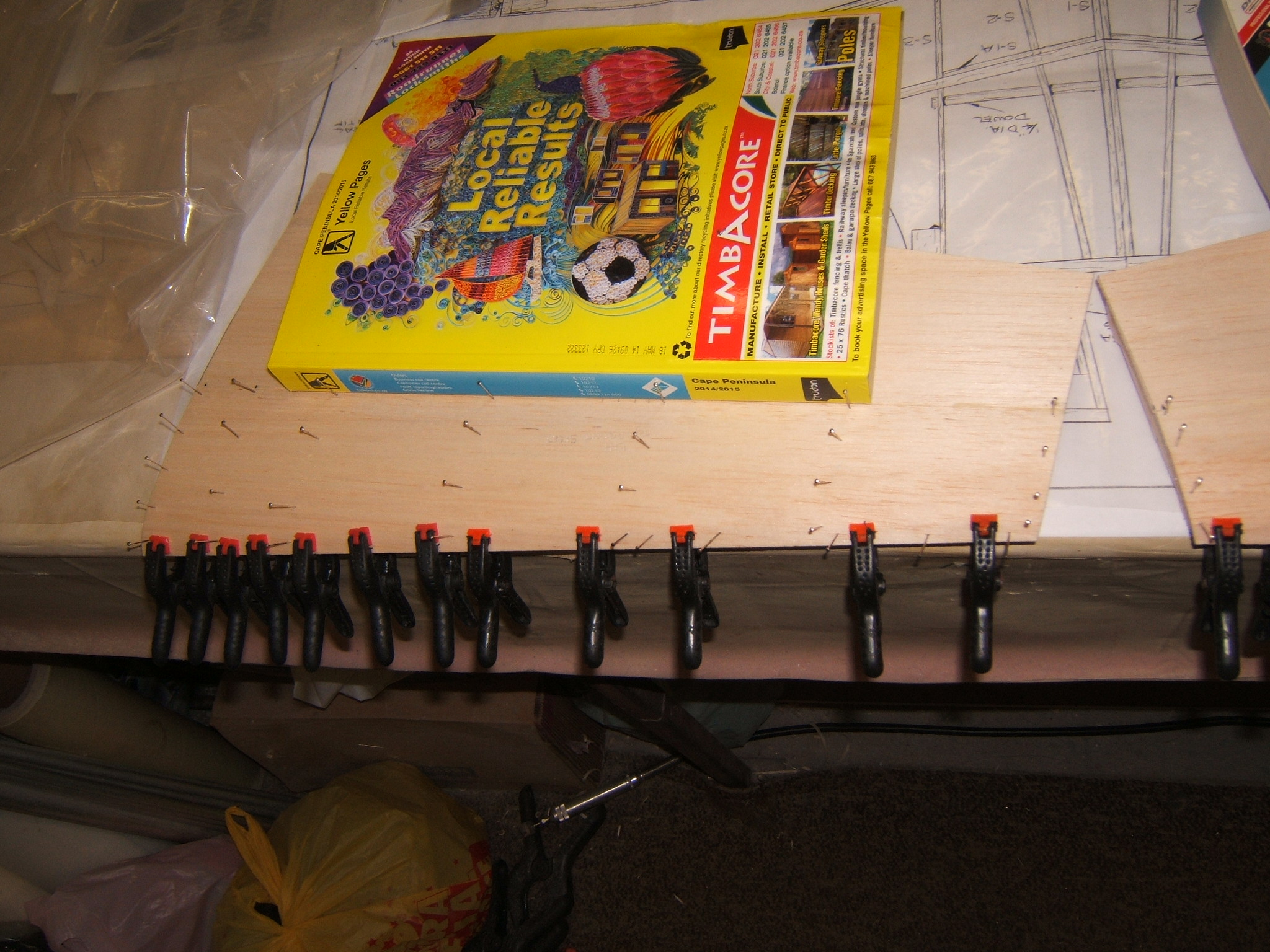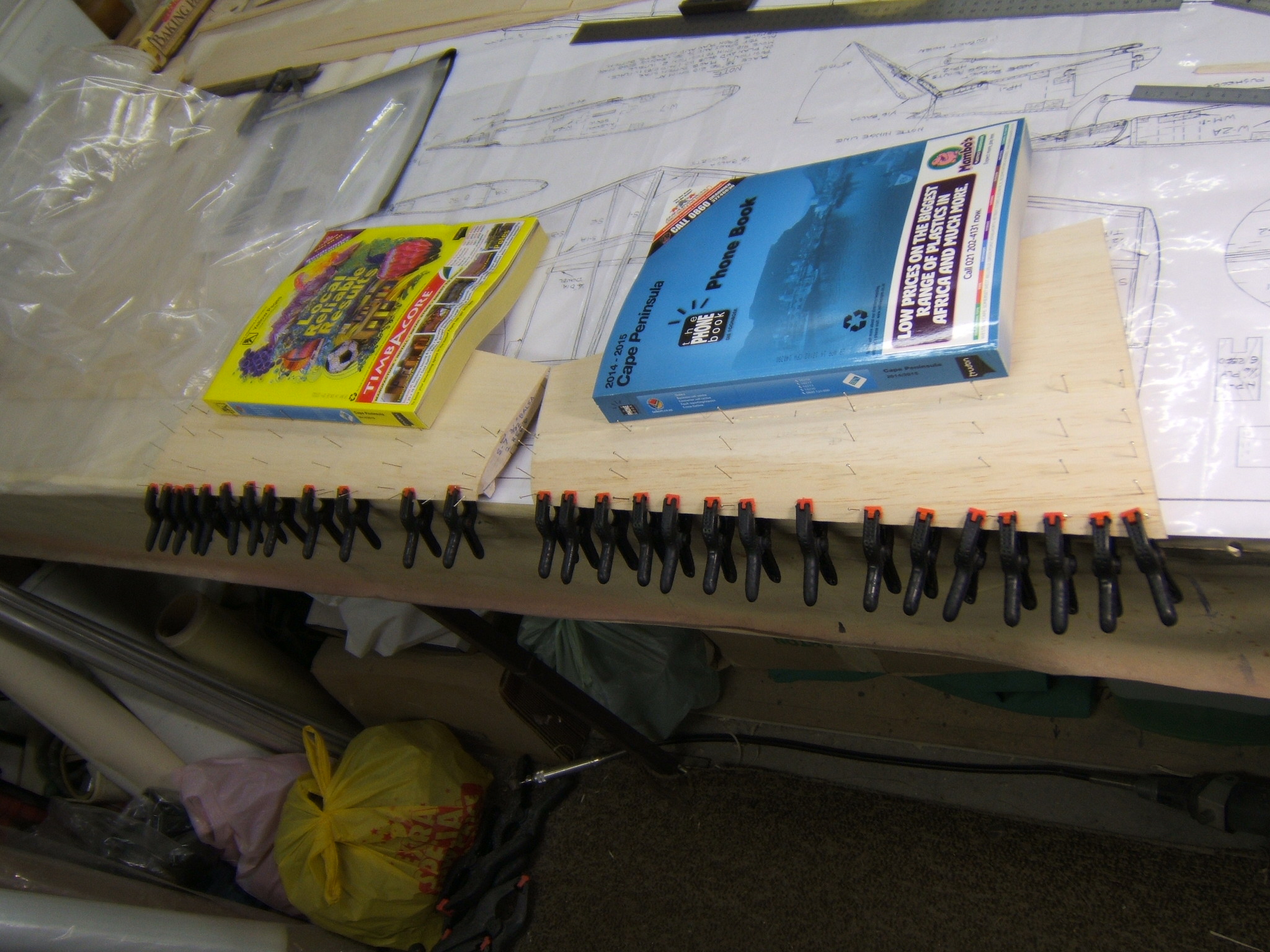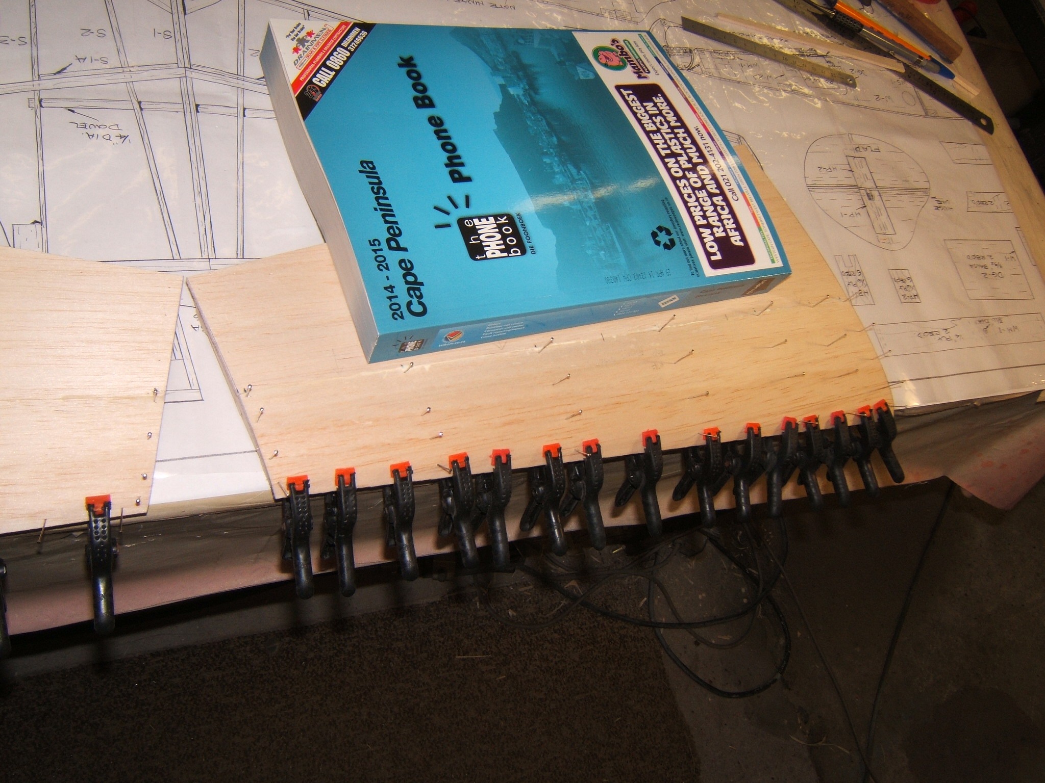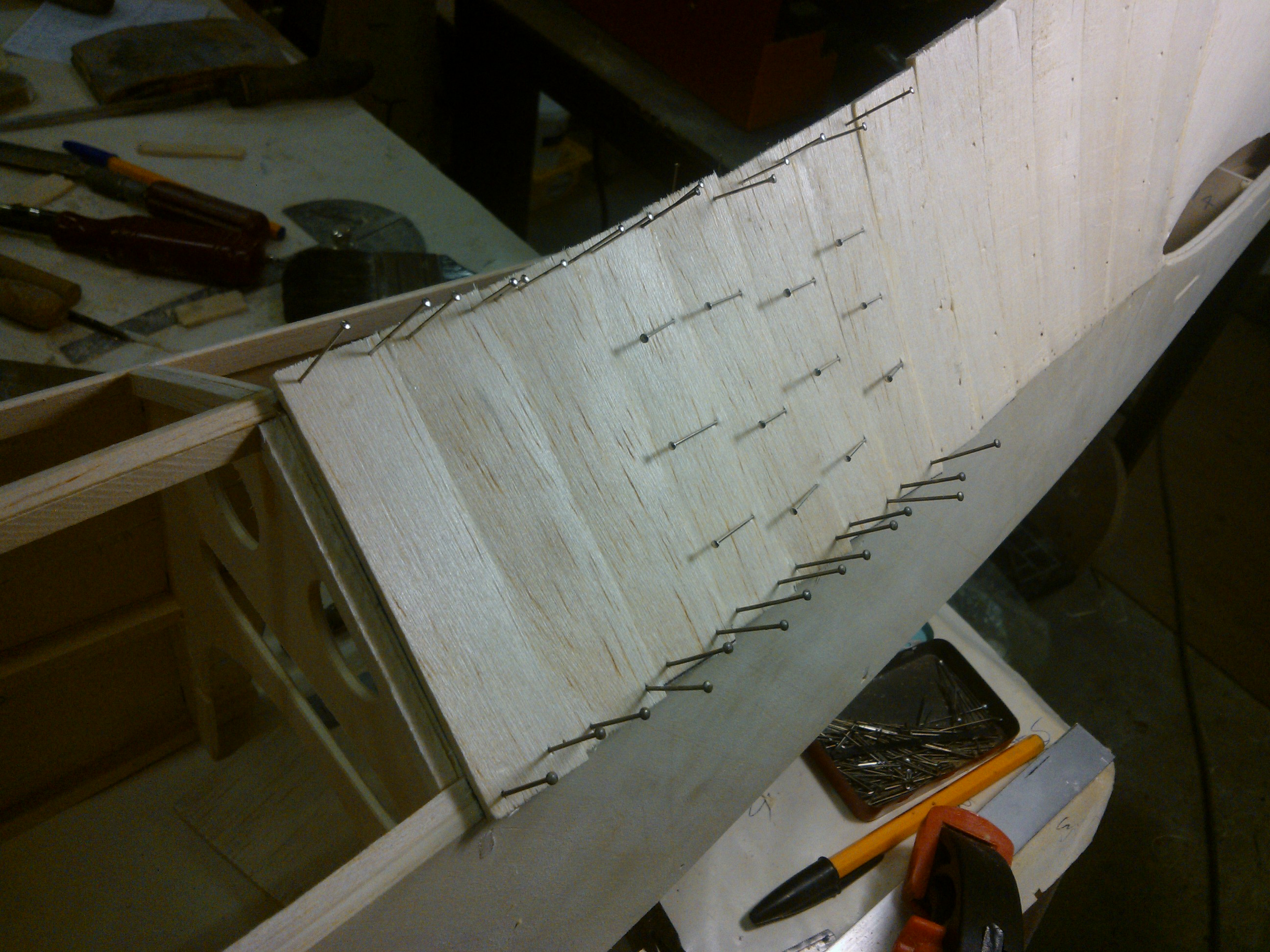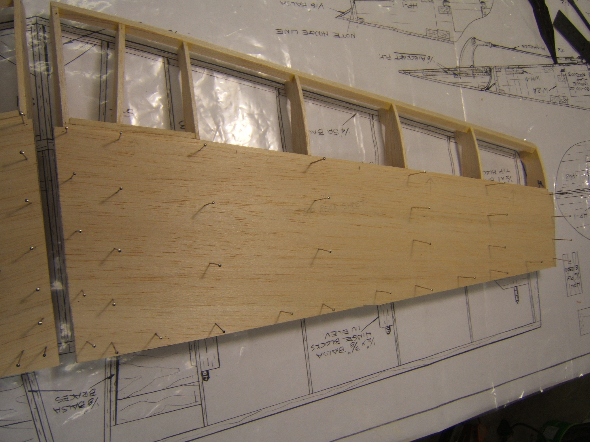 The forward section on the top sheeting has just been applied. The balsa wood was a little hard and although it was wet with amonia/water mix,it didn`t want to be held in place with pins along,on the LE. So clamps were used and the whole thing placed under paper weight. This would aid in keeping it straight.
