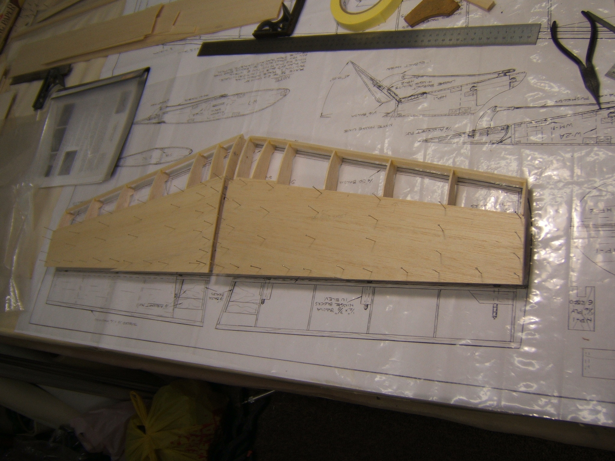 I have started the sheeting of the stab and left a 1/4" overhang on the TE side. This will be used to locate the correct hinge positions and later will be trimmed off.