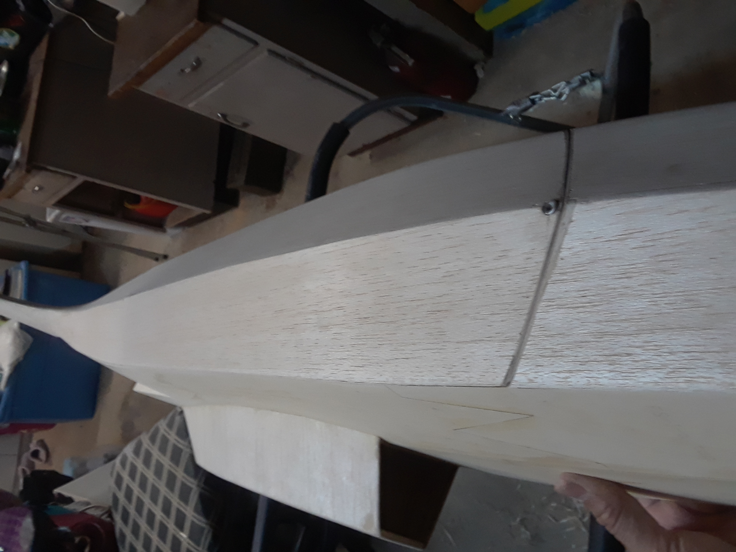 I gave the H stab a final touch here and there, it is now glued to the fuse, Im just waiting for the epoxy to dry, I used Six10 epoxy on the inside and 30 minutes epoxy on the outside, I was very surprised when it came time to fit the stab on the fuse, when eyed from behind it was perfectly aligned, after frizing it in its position with four spots of CA the wing was removed and the epoxy was added to the inside and outside of the stab.
