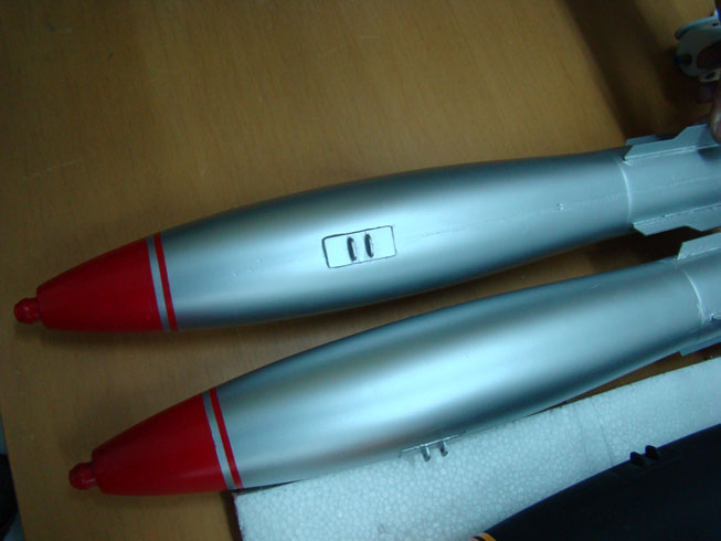 I will try to shoot a couple photos of the pylons with the servo and pin installed. The bombs are mk82 snake eyes, I did my own mold for these as the size and ballasting was more convenient, and less draggy then the ordinance in the kit. You also need to keep in mind that on the average you only get one toss per bomb, they don't hold up well. So whatever you use, I recommend you have multiples of it.