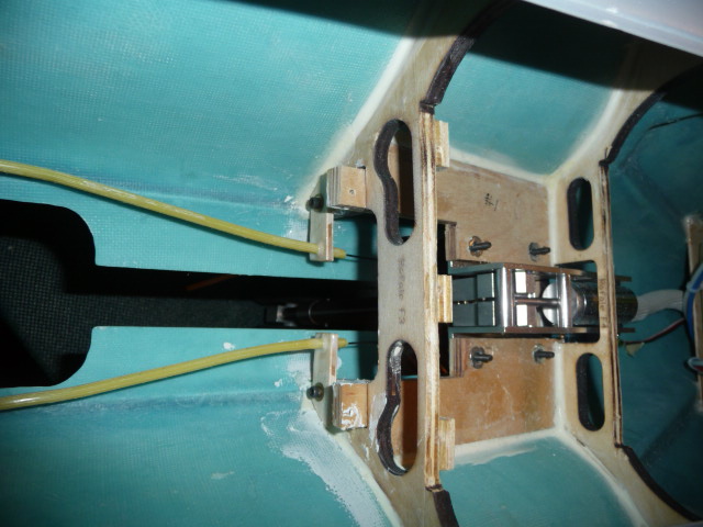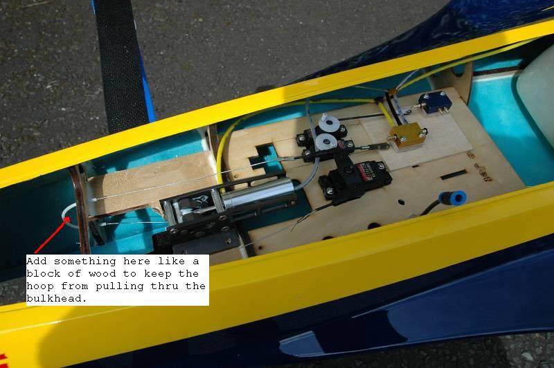 Yeah, you have to make something like half round pieces of 1/4" balsa and insert them on the inside of the plactic tubes & epoxy them in to keep the tubes in place - where the arrow shows in the above posted pic. Then the steering wires won't go loose as the tubes slip thru the bulkhead holes.