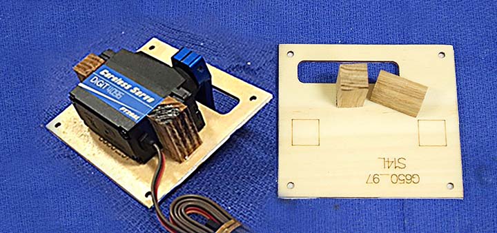 Assemble the servo to the cover plate using the wooden blocks and metal servo arm. Rough sand or drill small shallow holes in the bottom of the wooden blocks to increase the surface area of contact. Use a fillet of glue on the mating edges of the blocks to further reinforce adherence to the servo cover plate. http://www.rcuniverse.com/forum/atta...mentid=2157676 Shave the block where it touches the hinge point inside for a better fit. Pre drill the 4 servo recess corner holes on the horizontal stab, tap and add a drop of thin CA glue to strengthen the holes. http://www.rcuniverse.com/forum/atta...mentid=2157677http://www.rcuniverse.com/forum/atta...mentid=2157678 |