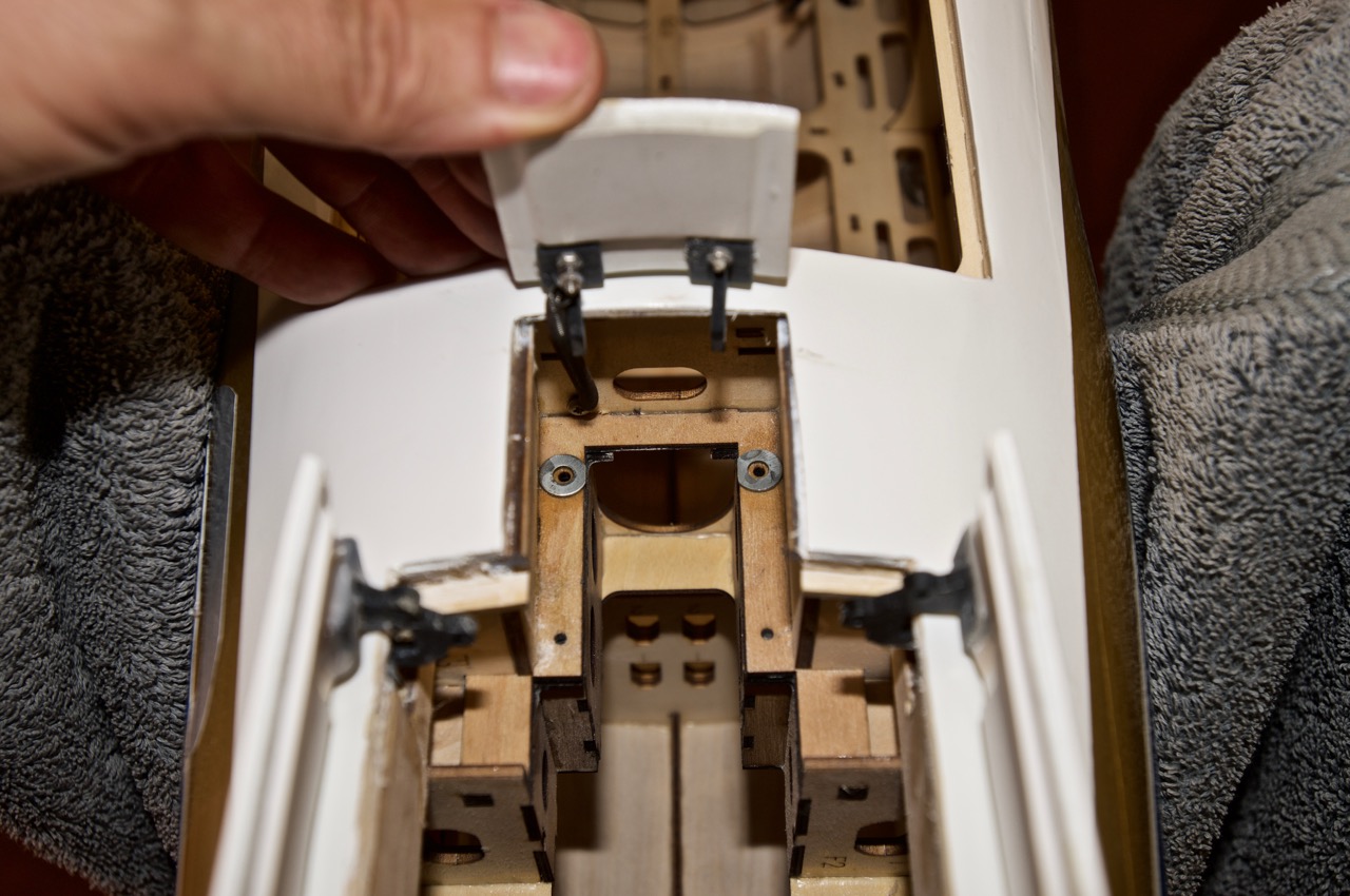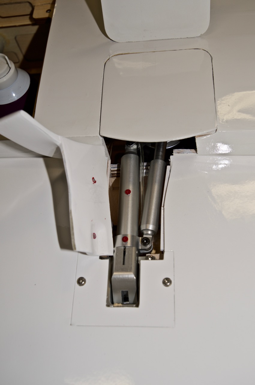 Remove the Oratex from the area where the servo horn plate is to be glued down at the base of the horns. Mount the servo to the servo hatch door then mount the door to the opening. Install the connecting rod. This will allow for the proper orientation of the location for the elevator horns. They should be perpendicular to the hinge line. There are two parallel horns that go through and are aligned by the slotted skirt. Make lines using a marker to locate the slot lines then cut them out with a Dremel tool. Use properly applied epoxy to glue in the horns and the alignment plate. http://www.rcuniverse.com/forum/atta...mentid=2157679http://www.rcuniverse.com/forum/atta...mentid=2157680http://www.rcuniverse.com/forum/atta...mentid=2157681http://www.rcuniverse.com/forum/atta...mentid=2157682 Use the connecting rods supplied, note the adjustment tools are provided. They will be adjusted later. Similarly install the other servos. Note that there is a single longer connecting rod. This is for the rudder. |