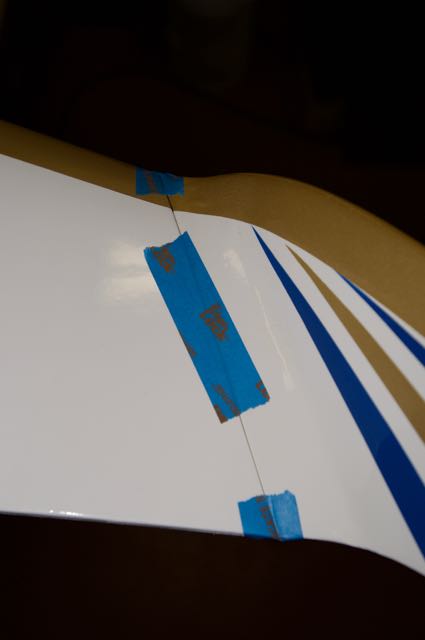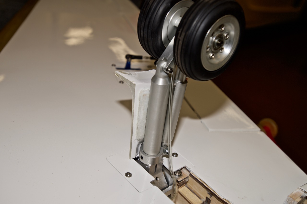 Put a drop of paint on the dear door mounting screw heads then put the gear door in place with the gear retracted. The paint will show you the location to drill the holes for mounting. Drill the holes then bevel the outside so the screws are recessed. Gently move gear up and down to make sure there is clearance in all locations. http://www.rcuniverse.com/forum/atta...mentid=2158180 http://www.rcuniverse.com/forum/atta...mentid=2158181 The gear door needs to be sitting off of the main strut. You cannot just tighten the screws down. Use thick felt or some spacers to hold the door away from the strut. Again, make certain the top of the gear door does not hit the wing when the gear is down for landing. Now you can run the brake line between the strut and the gear door. This way it is mostly hidden. |