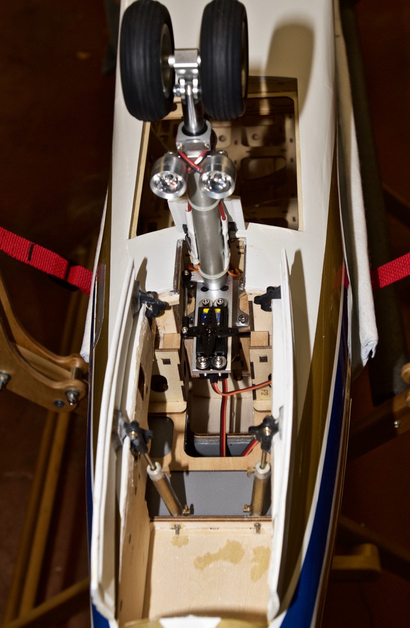 Mount the servo inverted under the steering servo tray. Use the rubber cushions on the servo but not the metal inserts. The mounting screws will not go through these. Use washers. Flatten one edge to have a better fit up against the servo, it may otherwise be too tight. Mount the plastic servo arm then the smallest, thin connecting rod to the strut steering arm and then the servo arm. One end is on the bottom the other end on the top so that the rod is mounted level when completed. Attach air line to the cylinder. The metal washer shims on the fuselage mounting recess may need to be trimmed to the opening. Use a drum sander on your Dremel. Place the mechanism into the recess then locate the holes, they should match up pretty well to the starter holes already in place. Drill, tap then strengthen the holes with thin CA glue. Mount the nose gear to the fuselage. Connect air lines to the gear doors. Test the nose gear function and the gear doors. http://www.rcuniverse.com/forum/atta...mentid=2158293 http://www.rcuniverse.com/forum/atta...mentid=2158294 |