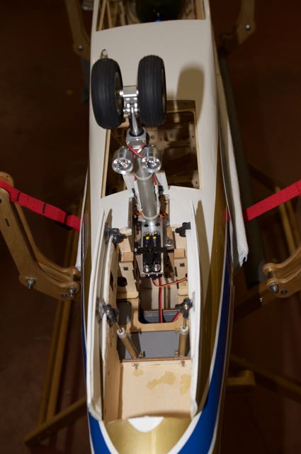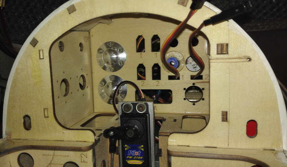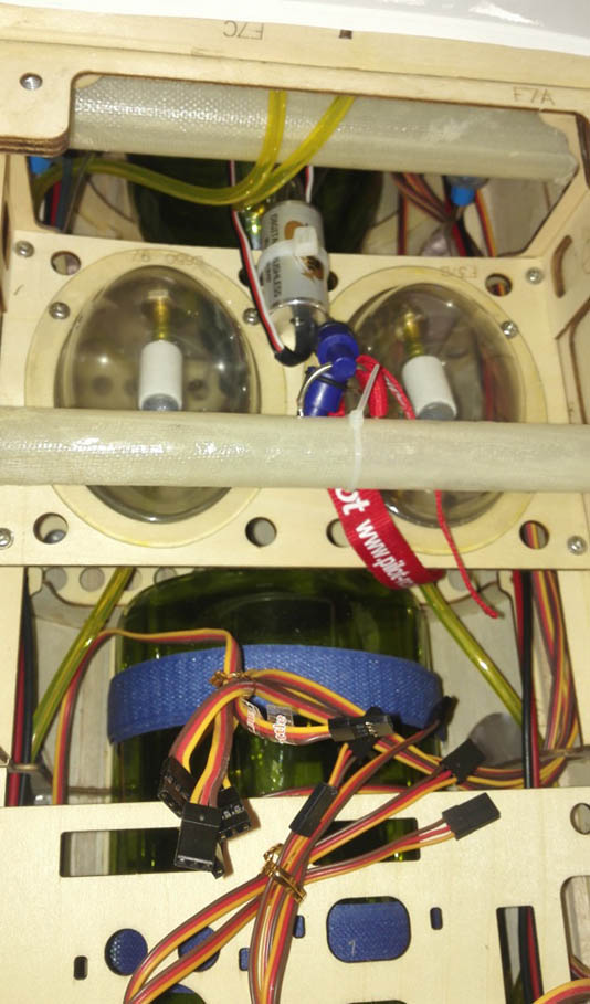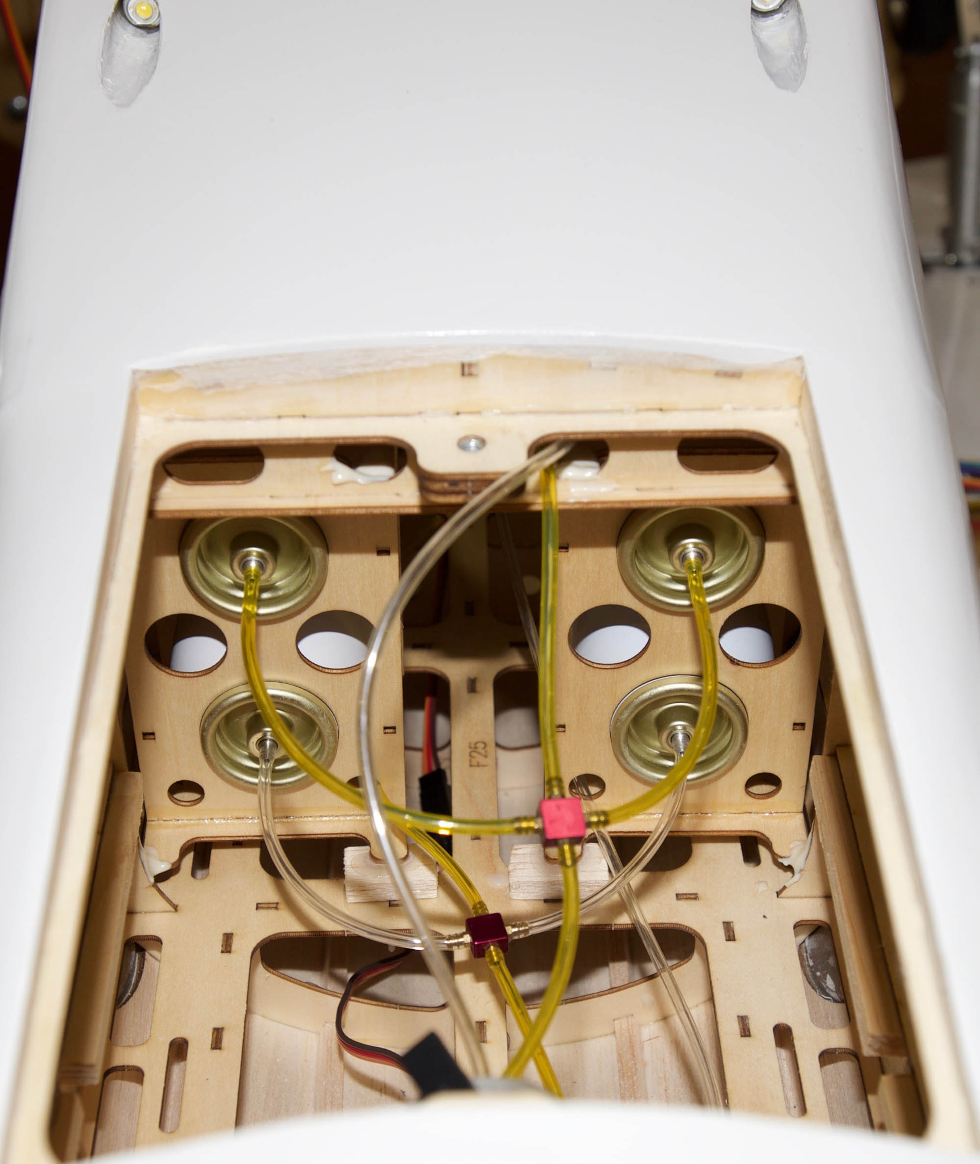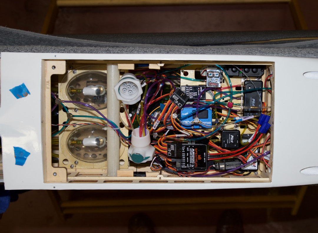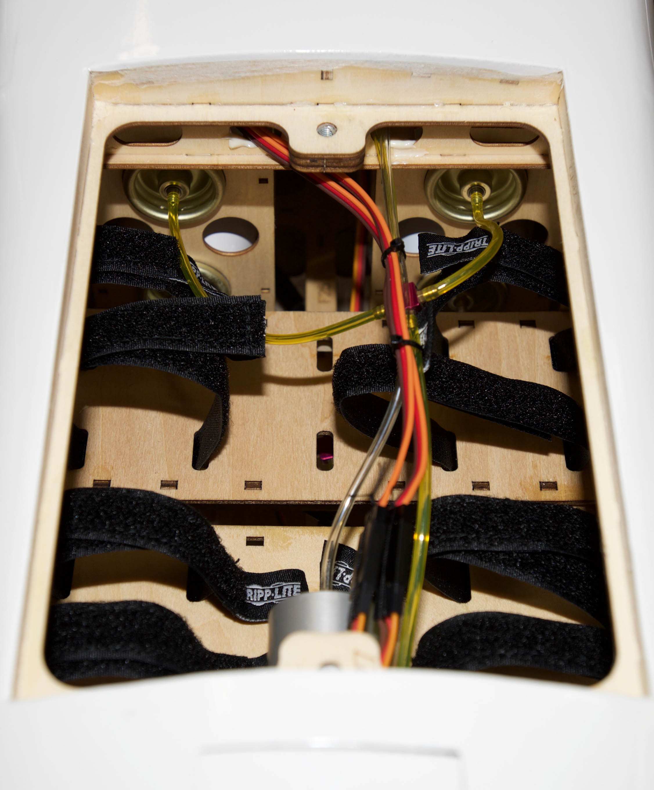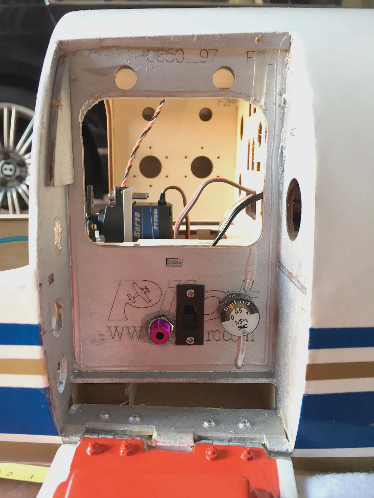 You can also use the cabin door area for electronics. I added a BVM air filler, the switch for the AR12120 Spectrum receiver and the air fill pressure gauge to this area. The fuel fill lines are going to come out of the most rear hatch to fill the fuel cells,