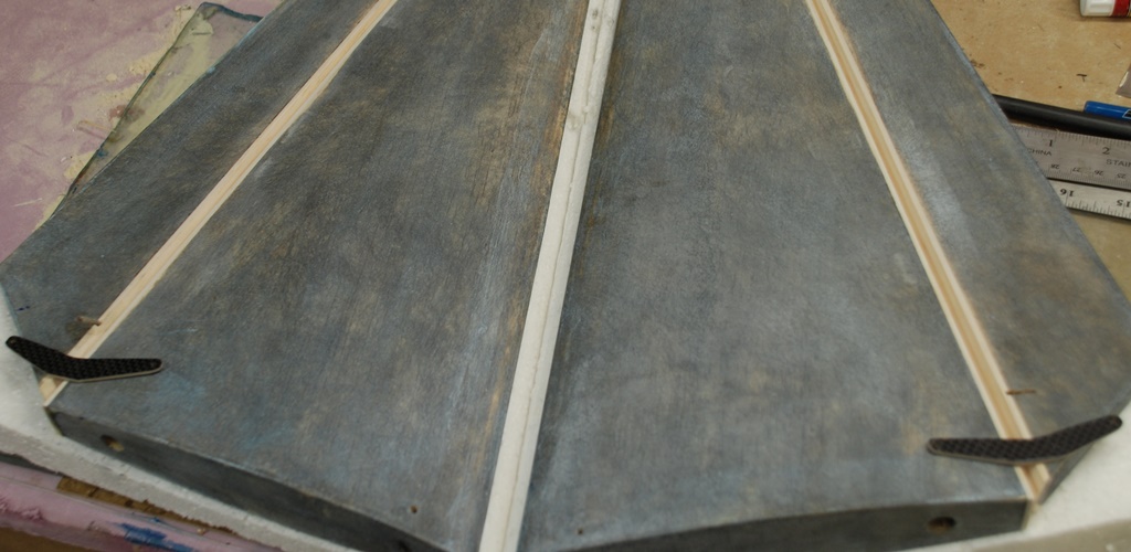 ' The skins are stiffened and sealed with laminating (thin) epoxy on the inside. I rub off as much as I can with paper towels. Enough remains to stiffen and seal the inside surface. Each stab skin gains about 1 gram of epoxy from this treatment. '