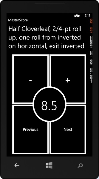 Also, I switched from a button-based scoring to a simple gesture scoring method (swipe down for -1/-.5, up/left for +1/+0.5, swipe right for next maneuver, I don't recall what NO was but that's supported as well) with the main screen showing the aresti for the maneuver and the maneuver is spoken to you (optionally) as well as the updated score as you make score changes.